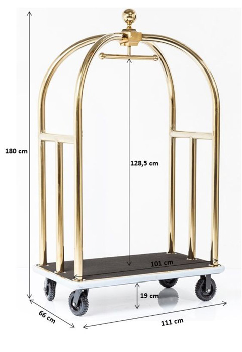 Här är en riktigt klassisk bagagevagn och annorlunda klädhängare som vi ser på hotell och på film men denna kan du ha ditt eget hem - i hallen, sovrummet eller i butiken. Bagagevagnen har de typiska designelementen som känns igen från de klassiska hotellen.