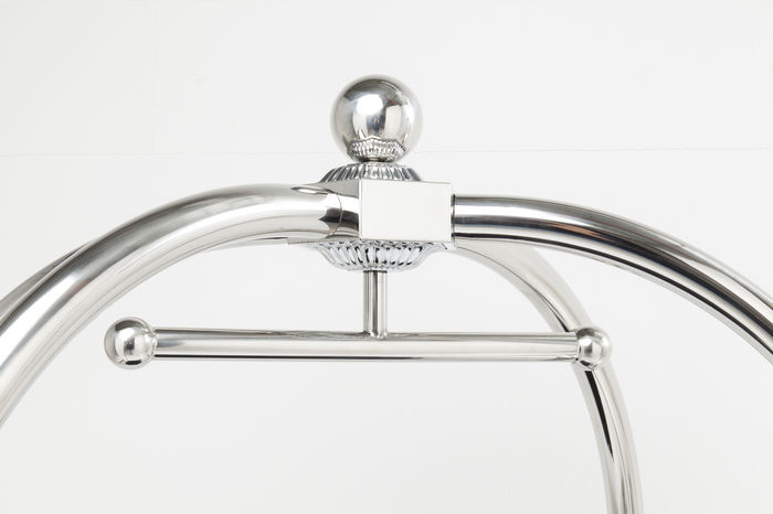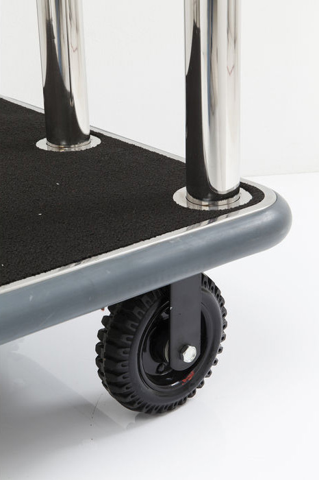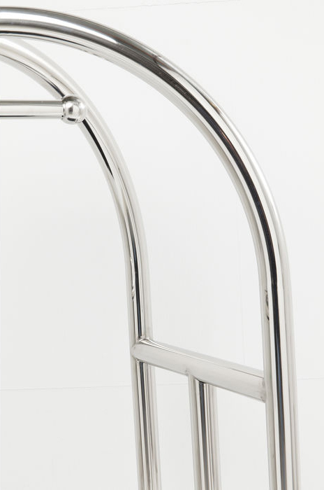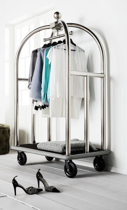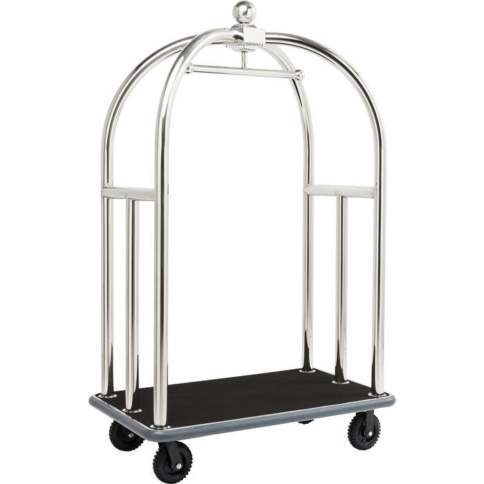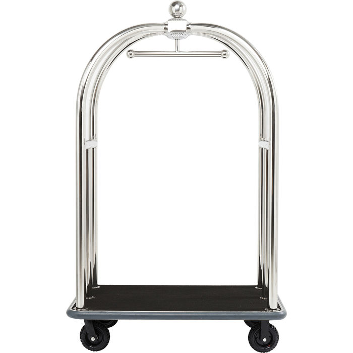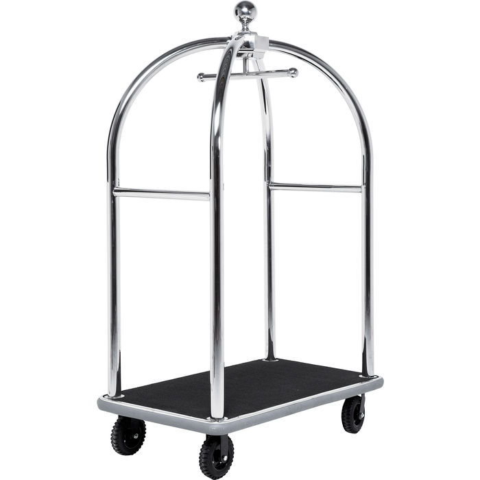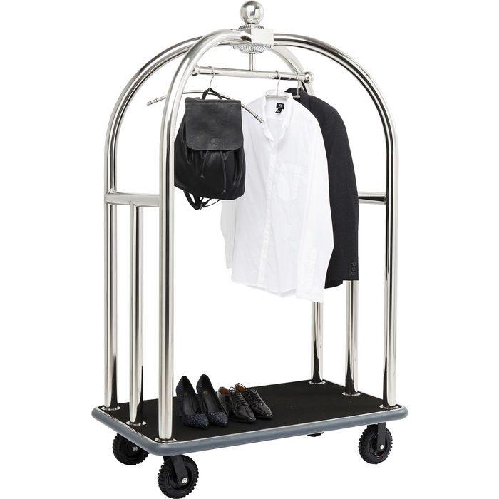 Här är en riktigt klassisk bagagevagn i blank krom med rejäla hjul. En klart annorlunda klädhängare som vi ser på hotell och på film men denna kan du ha ditt eget hem - i hallen, sovrummet eller i butiken. Bagagevagnen har de typiska designelementen som känns igen från de klassiska hotellen.