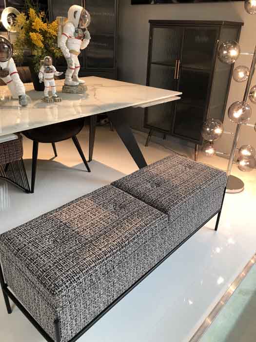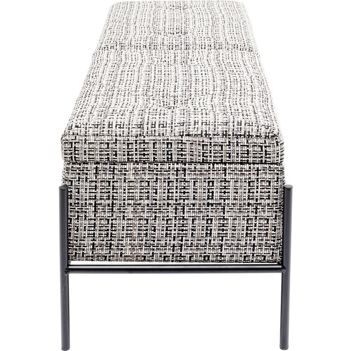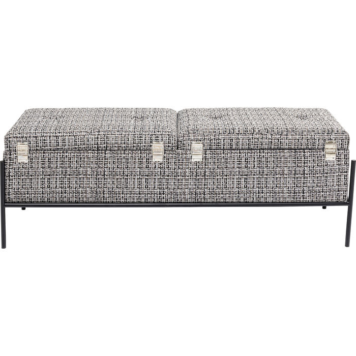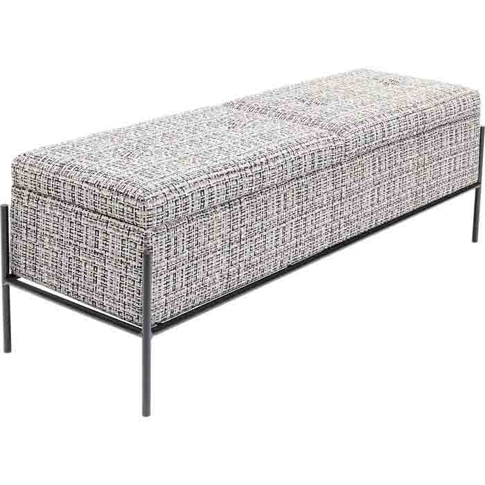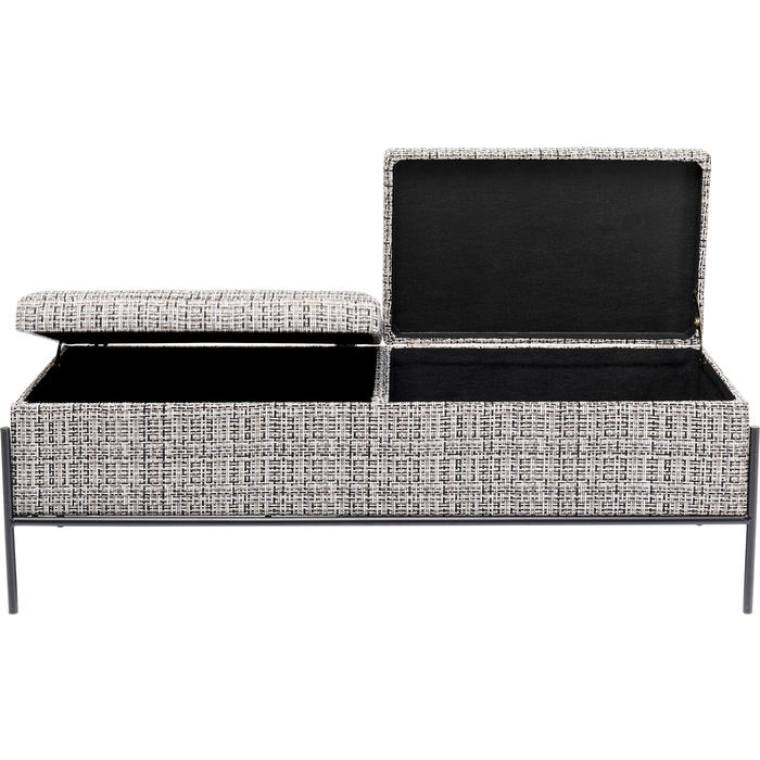 En ny favorit är denna snygga och praktiska sittbänk med plats för dold förvaring. När vi först såg bänken på vår inköpsresa så visades den som sittmöbel vid ett matbord och då kan förvaringen vara smart för exempelvis dukar, servetter, tallriksunderlägg m.m. Annars ser vi även den här bänken som den optimala hallmöbeln med plats att sitta på och förvara vantar, sjalar m.m. och i sovrummet för extra täcken och kuddar. Bänken har en stilren, modern design och fint tyg med grov struktur i linne och "salt & pepper" mönster. Bänken är stadig att sitta på och har två öppningsbara lock. Max belastning: 180 kg.