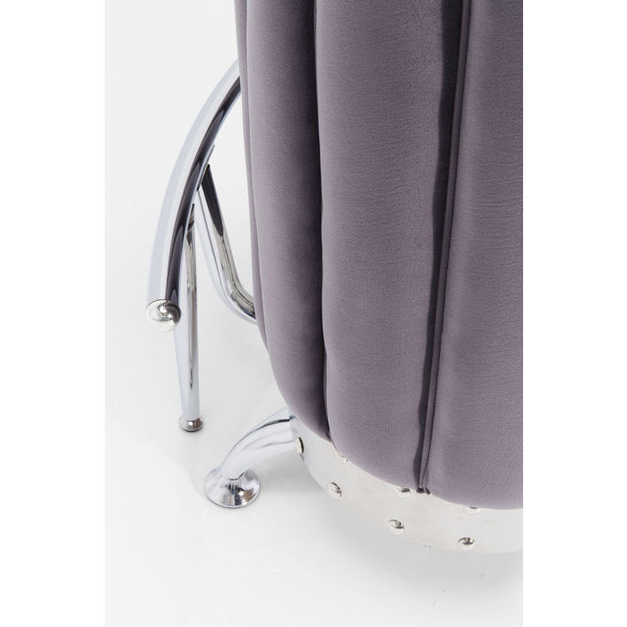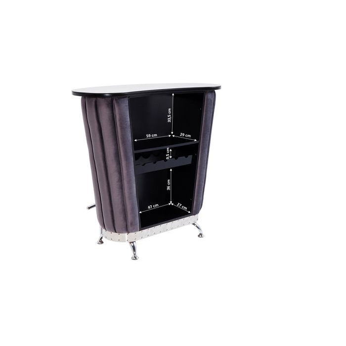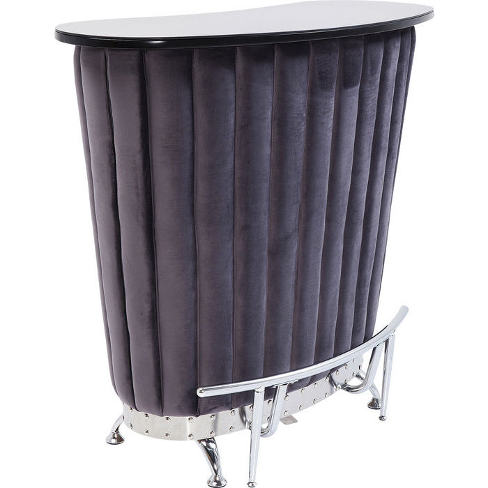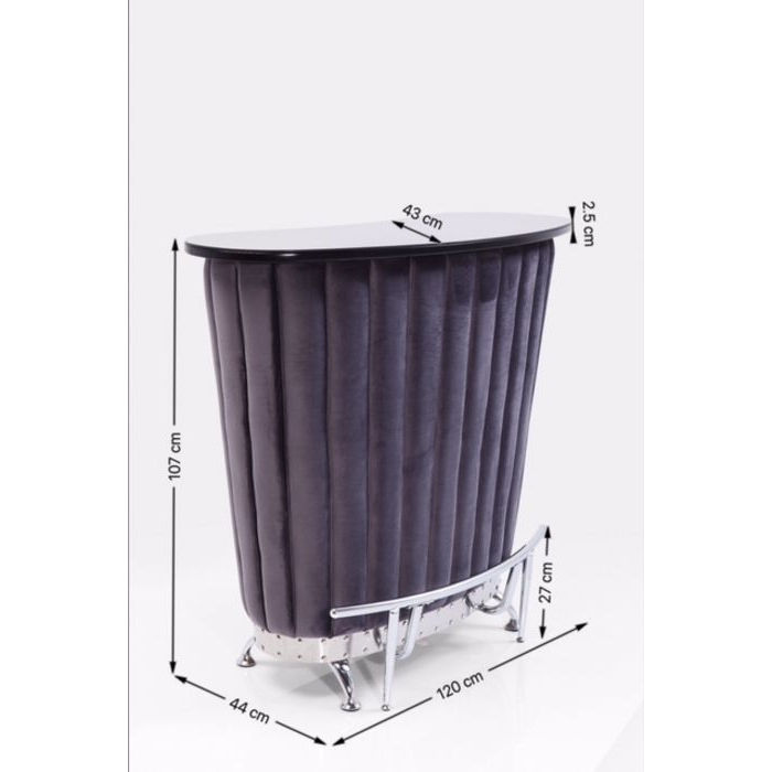 En glamorös bardisk som gör cocktaildrinken än godare! Bardisken är nätt men rymmer ändå gott om plats med hyllor och vinställ för flaskor, glas och drinktillbehör. Disken har en lyxig front klädd i veck av grå sammet med fotstöd och nitad sockel i krom. Bordsskivan har en tålig och praktiskt svart glasskiva - lätt att torka av och hålla ren. Material: stomme av mdf, lackad eukalyptusträ. Hyllor i oljad mdf samt ben och sockel i rostfritt kromat stål. Toppskiva i härdat, färgat glas och front med fyllning av kallskum samt klädsel i syntetsammet. Mått: höjd 104 x längd 120 x djup 48 cm. Vikt: 43 kg.