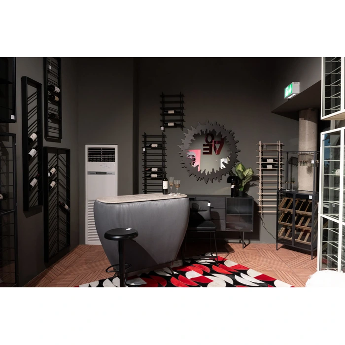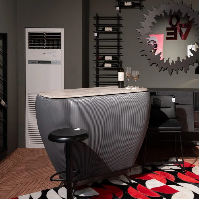 Stilrent barskåp i grått med smart förvaring – en sobert elegant statementmöbel i hemmabaren.