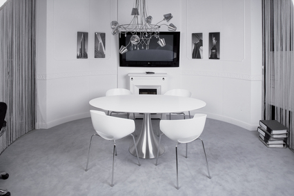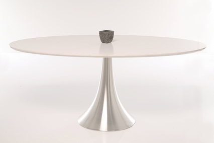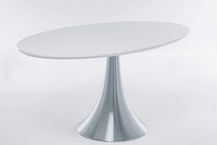Ett smakfullt ovalt bord med matt kromad trumpetfot och vit lackad bordsskiva. Bordet ger plats för 6-8 stolar. Matbord Grande Possibilita passar bra både som konferensbord och matbord.