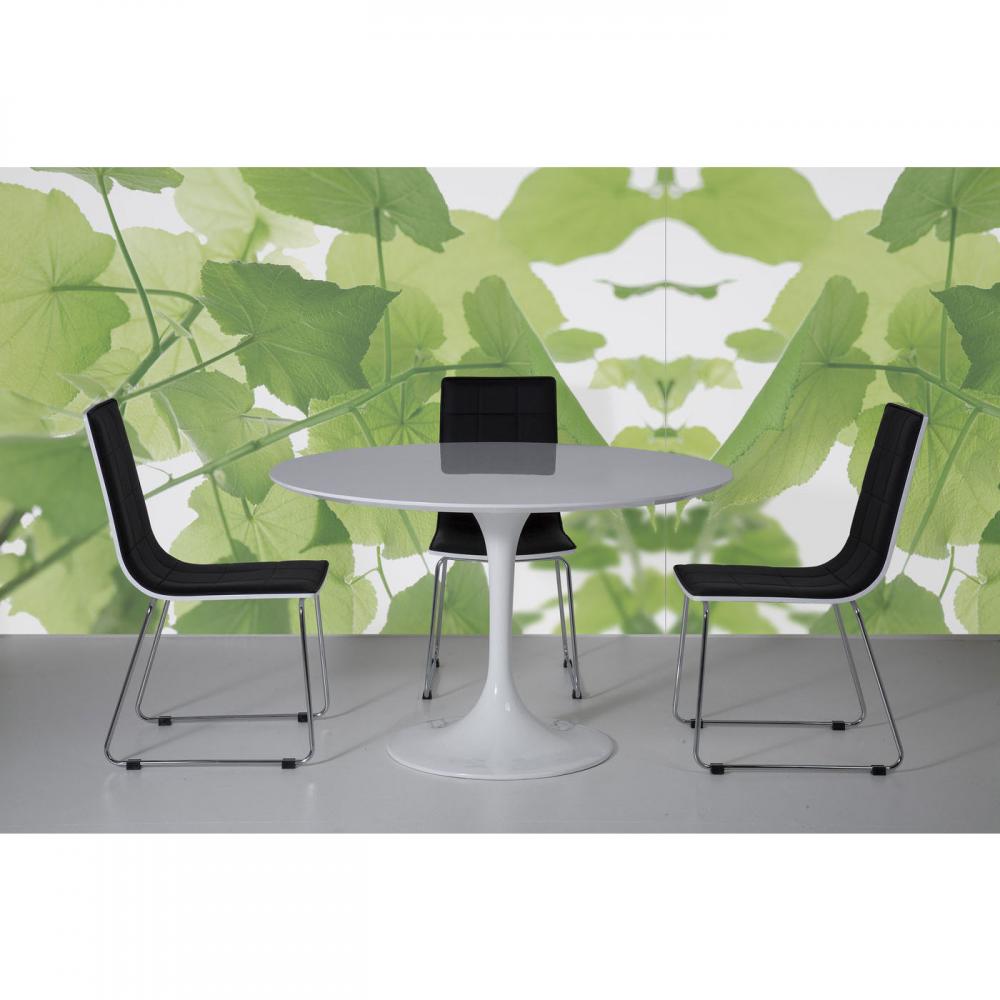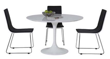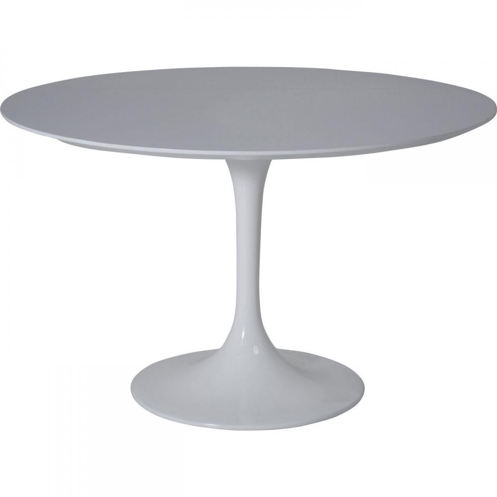 Ett runt, vitt matbord i modern retro stil med pelarfot och bordsskiva i fin blank finish. Passar utmärkt till de flesta stolar för både för formens, måttens och funktionens skull. Elegant och mycket stabilt! Levereras i två delar. Enkel montering av underredet.