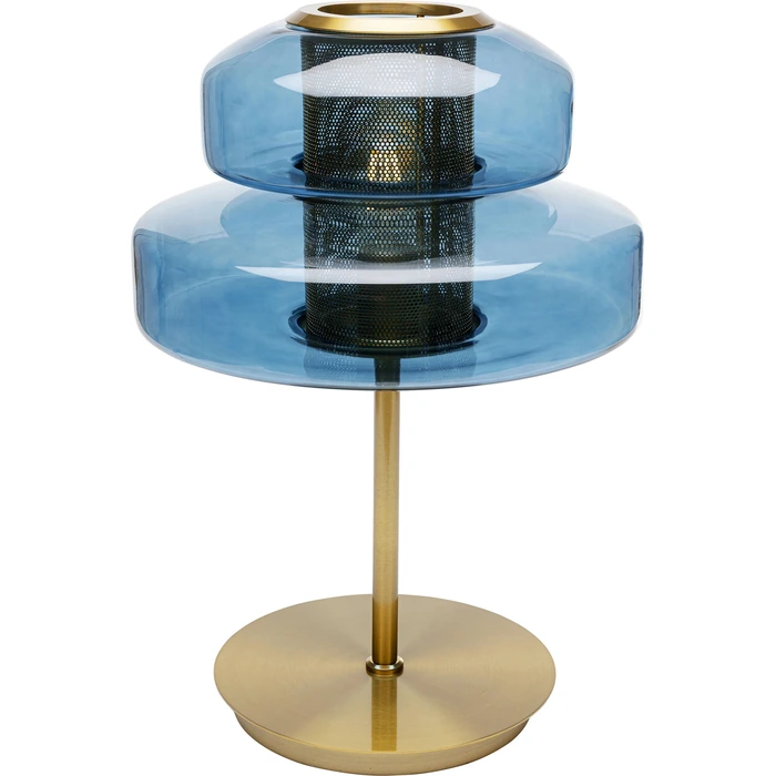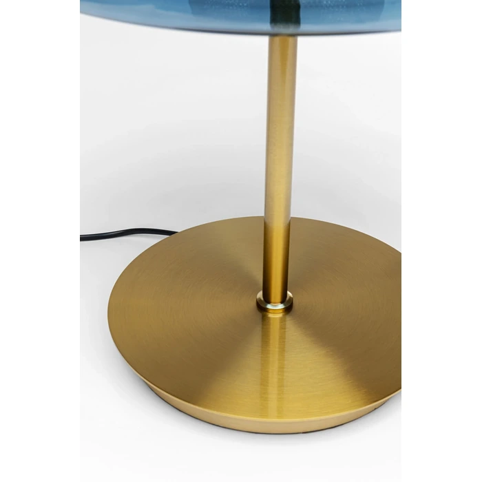 Elegant blå bordslampa med skulptural glaskupa och detaljer i guld.