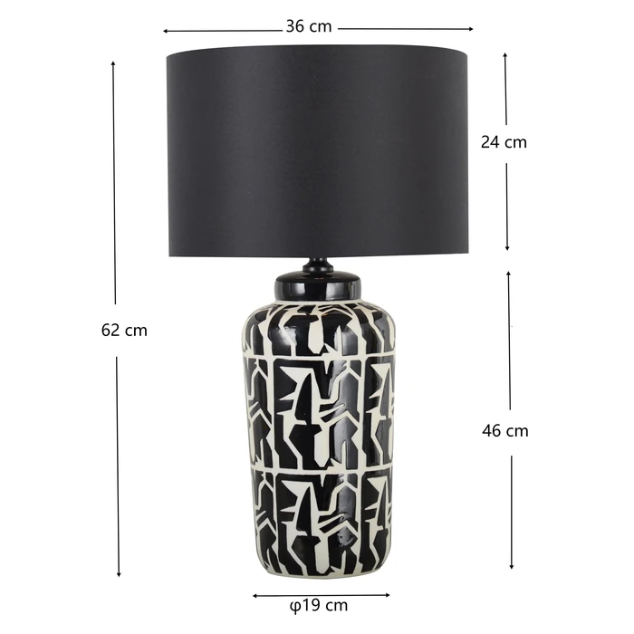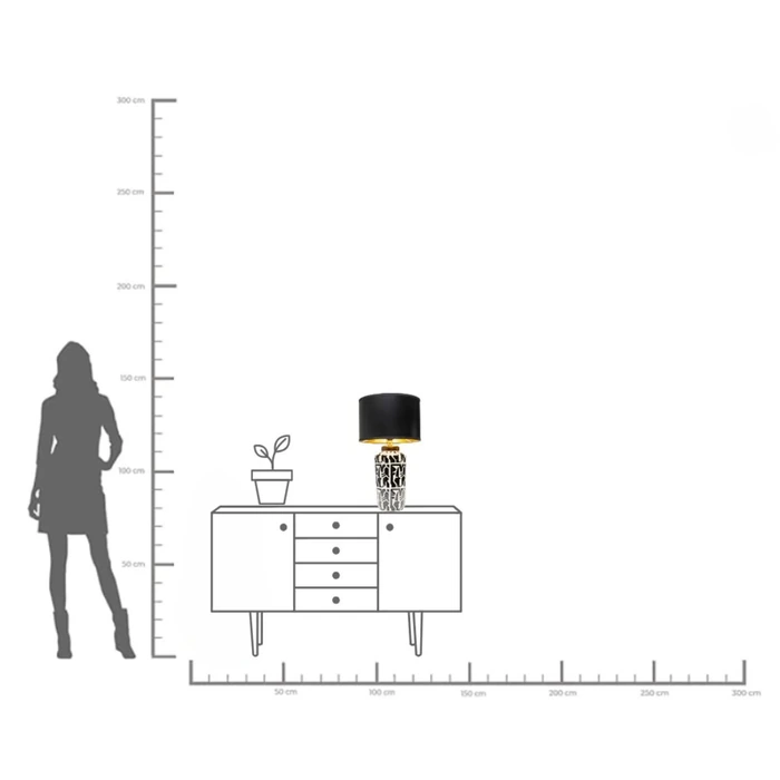 Bordslampa Artistico är en dekorativ designlampa som kombinerar konstnärligt uttryck med funktionell belysning. Lampfoten har ett grafiskt mönster i svart, vitt och guld som ger lampan ett unikt och kreativt utseende. Den skulpturala basen fungerar nästan som ett konstobjekt och gör lampan till ett naturligt blickfång i rummet.