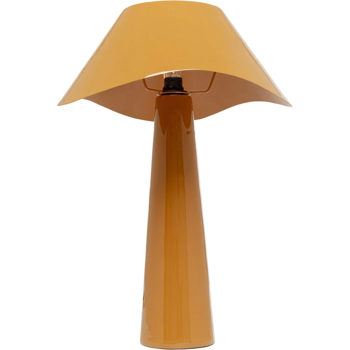 Retroinspirerad bordslampa i orange med rund skärm i emaljerat stål. Ger varm och lekfull belysning i hemmet.