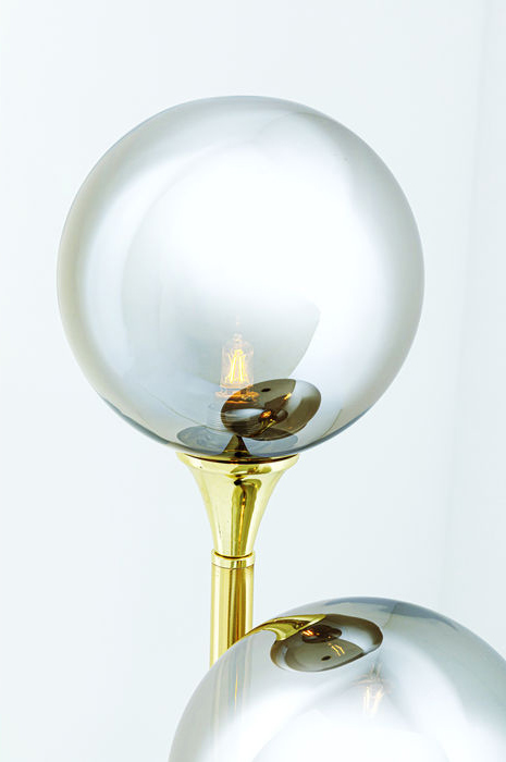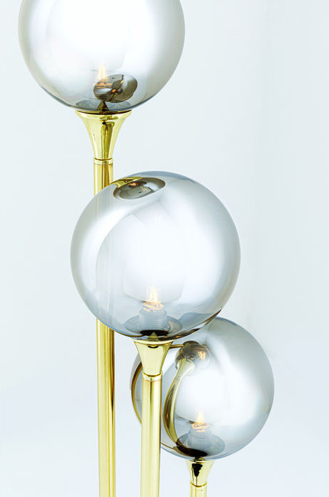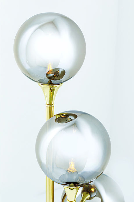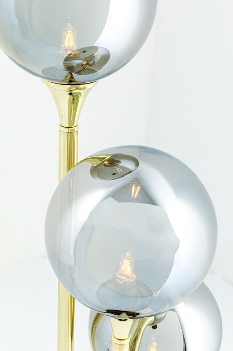 En glamorös och annorlunda bordslampa i modern Art Déco-stil. Lampan består av tre belysta klot på olika höjd. Glaskloten har en elegant silvergrå ton med en semitransparent spegeleffekt som gör belysningen extra unik och till en dekorativ eye-catcher - som fönsterlampa, i hallen eller på sidobordet vid soffan.