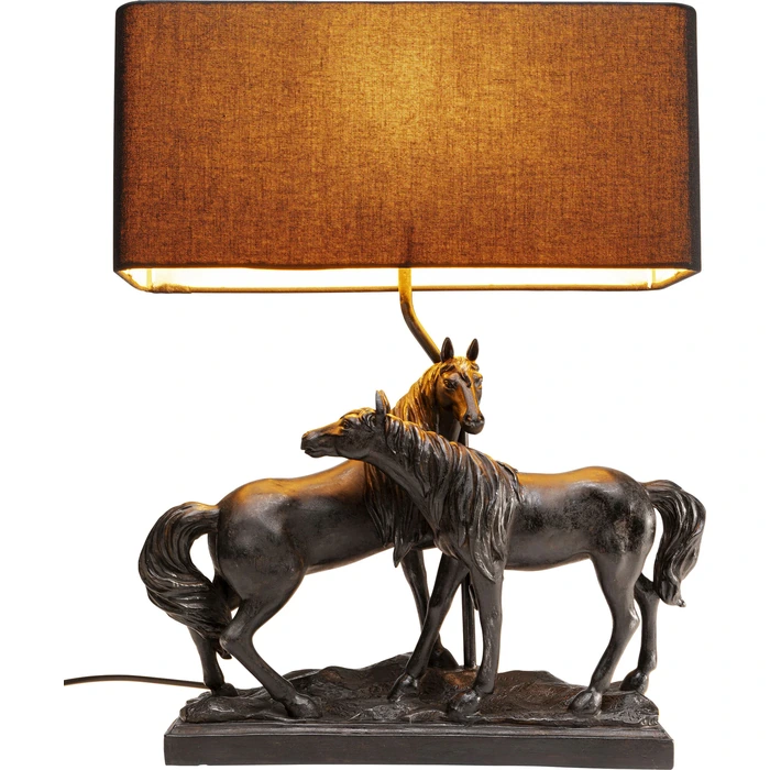 Bordslampa med hästmotiv och varm belysning från guldtonad insida.