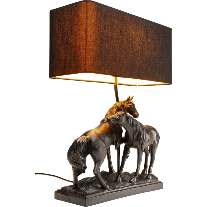 Bordslampa Horse Family 53 cm kombinerar djurmotiv och elegant design i en dekorativ ljuskälla som ger rummet personlighet. Två gracila hästar bildar den ornamenterade lampfoten och skapar ett uttryck som känns både konstnärligt och harmoniskt.