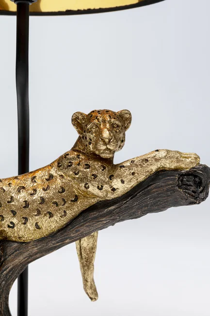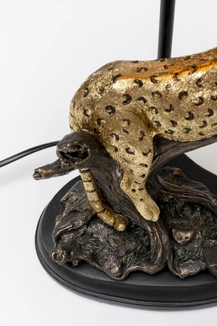 Den detaljerade leopardfiguren i polyresin vilar graciöst på en trädgren och skapar en exklusiv och exotisk känsla i rummet. Den svarta lampskärmen med guldfärgad insida ger ett varmt och behagligt ljus. Perfekt för att addera en sofistikerad touch till vardagsrummet, sovrummet eller kontoret. Lampan har en E27-sockel och är kompatibel med utbytbara ljuskällor upp till 40W.