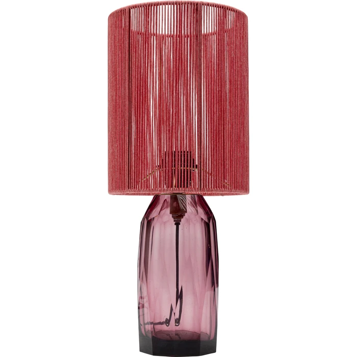 Kompakt bordslampa i färgat rosa glas med textilskärm. Ger ett mjukt, stämningsfullt sken – perfekt på sidobord eller som sänglampa.