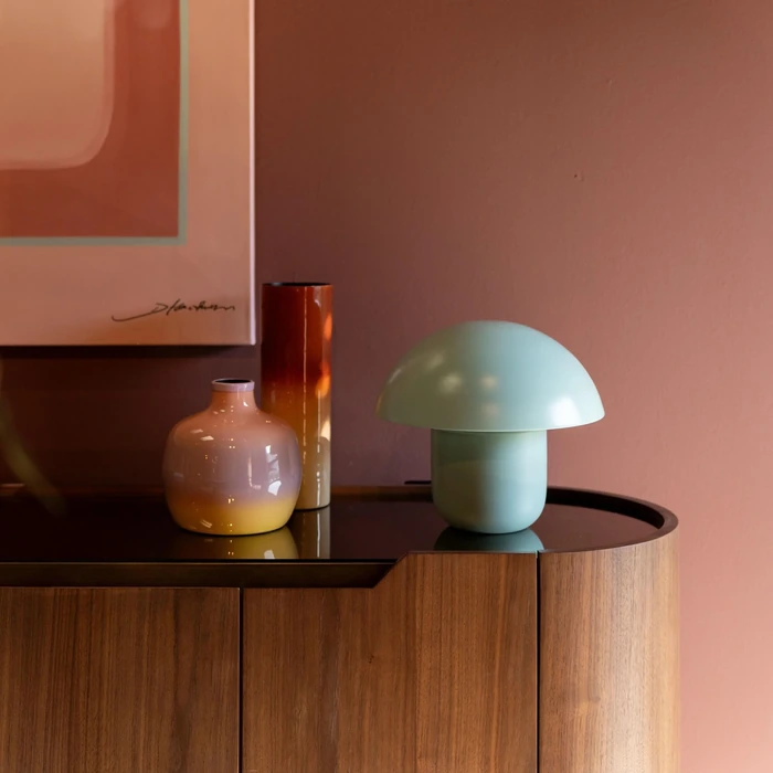 Bordslampa Mushroom i mint är en dekorativ och tidlös ljuskälla med sin karakteristiska svampform och moderna färgton. Den matta mintgröna finishen ger ett fräscht och stilrent uttryck som passar lika bra i sovrum som i vardagsrum eller på ett sidobord.