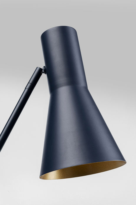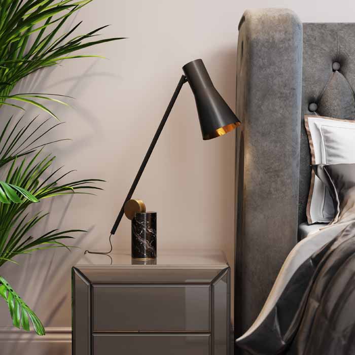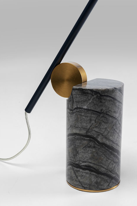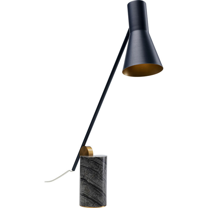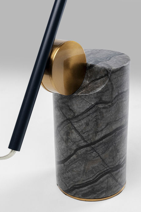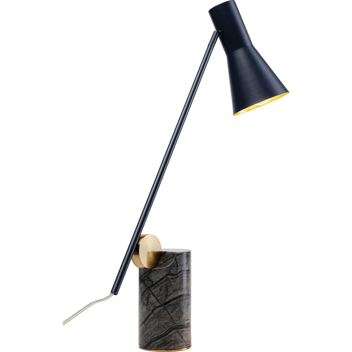 Snygg, svart bordslampa i grafiskt stilren design med böjbar arm och skärm i stål som vilar på en cylinderformad fot i gråsvart marmor. Lampan passar både som skrivbordslampa, sänglampa och dekorativ belysning på ett sidobord eller konsolbord. Lägg märke till de fina detaljerna! Skärmen har mässingsfärgad insida.