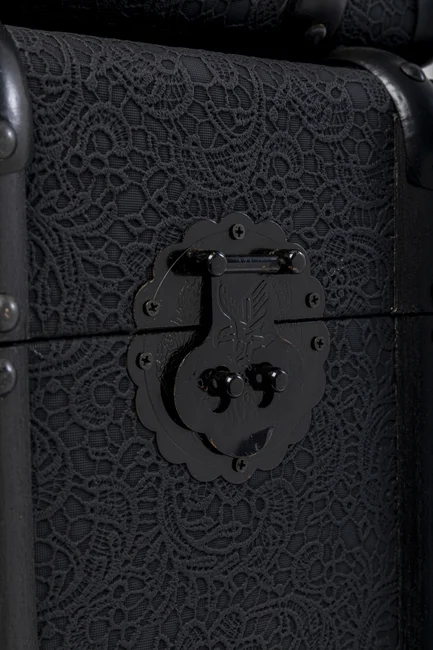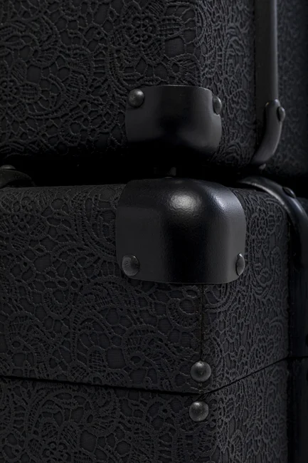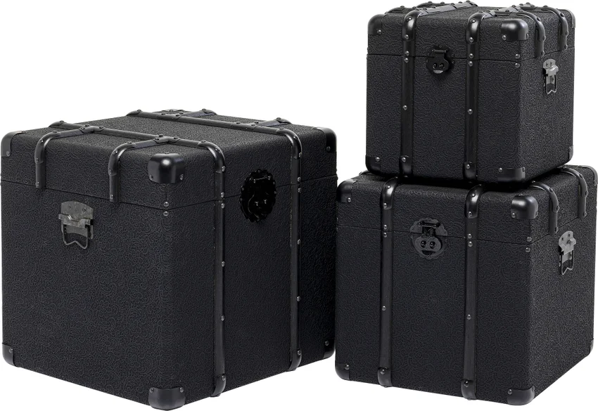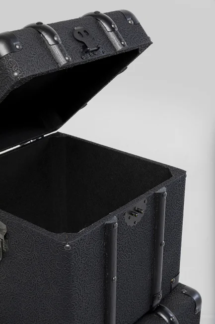 Box Travel - Förvaringslådor Svart är ett set med tre stora och dekorativa förvaringslådor i svart med vackert, blommigt mönster, designade för att ge både stil och funktion. Dessa lådor, inspirerade av klassiska resväskor, erbjuder gott om förvaringsutrymme och kan enkelt flyttas runt tack vare de eleganta handtagen. Använd dem för att förvara kuddar, filtar eller andra hemaccessoarer när de inte används. Denna förvaringslösning passar perfekt i en vintage-, industriell eller modern inredning och kan även ge en charmig kontrast i ett lantligt hem.