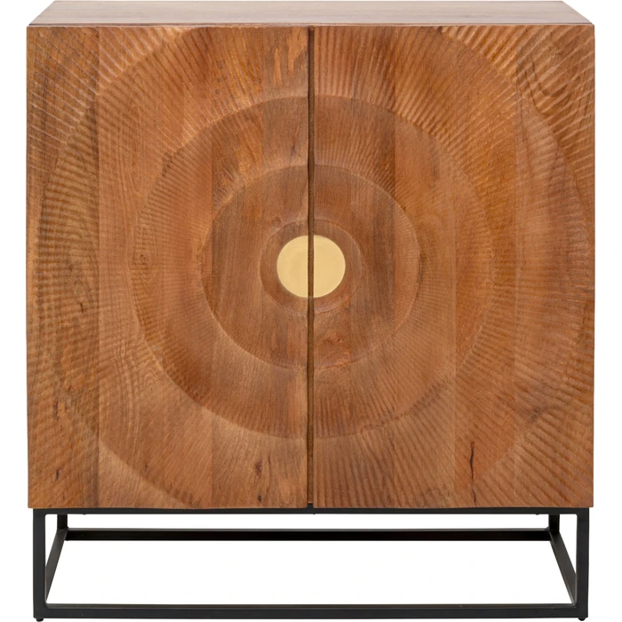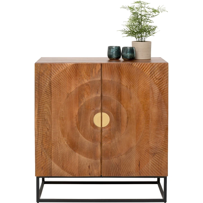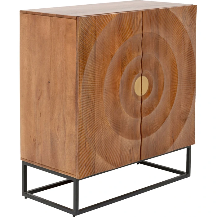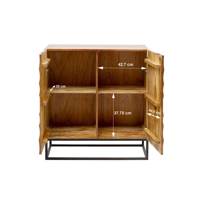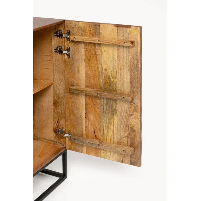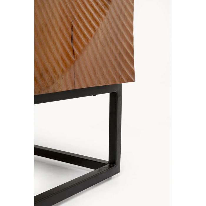Handgjord byrå i massivt mangoträ med skulpterad front och svart stålram.