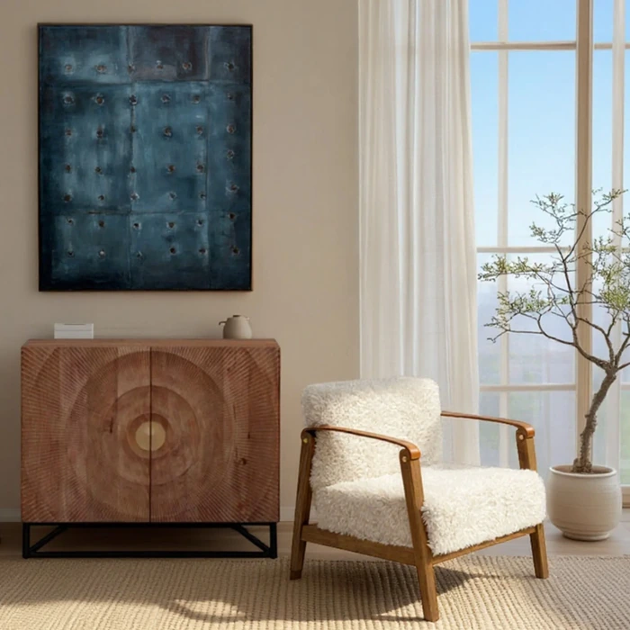 Byrå Madeira Bright är en karaktärsstark förvaringsmöbel där hantverk och design möts i ett uttrycksfullt helhetsintryck. De handskurna fronterna i etniskt inspirerat mönster skapar djup och liv tack vare sin skulpturala struktur, medan det varma massiva mangoträet tillför naturlig värme och ett levande ådringsspel.