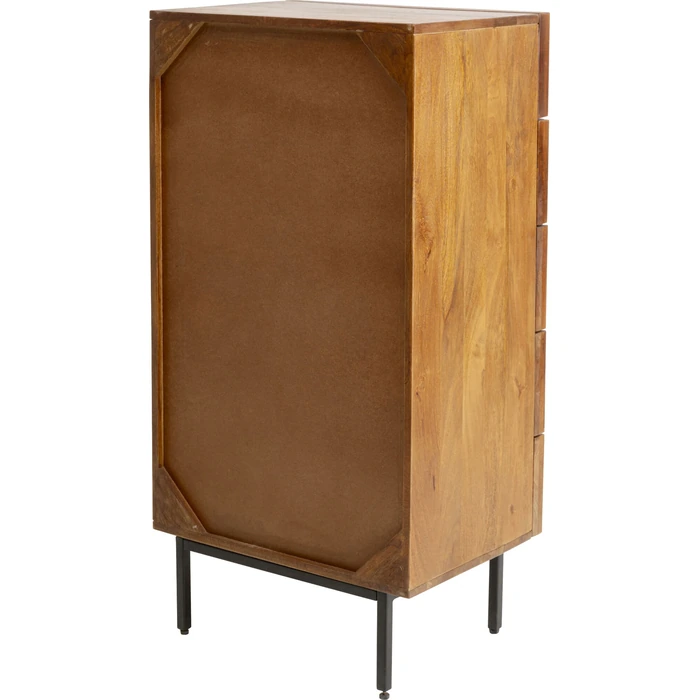 Denna eleganta byrå har fem rymliga lådor, alla med individuellt snidade frontpaneler som skapar en levande, taktil yta. Varje låda är unik, vilket ger möbeln en charmig och personlig prägel. Den lackerade ytan lyfter fram mangoträdets naturliga ådring och ger en varm, inbjudande känsla.