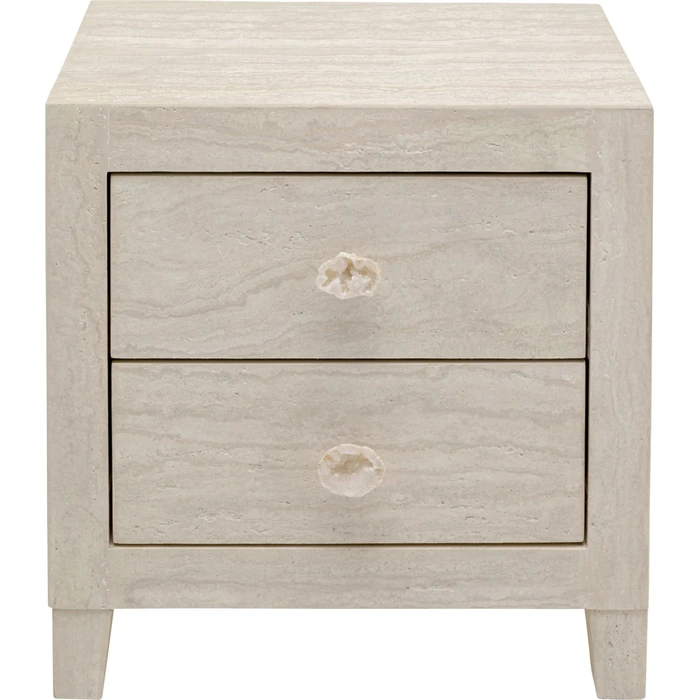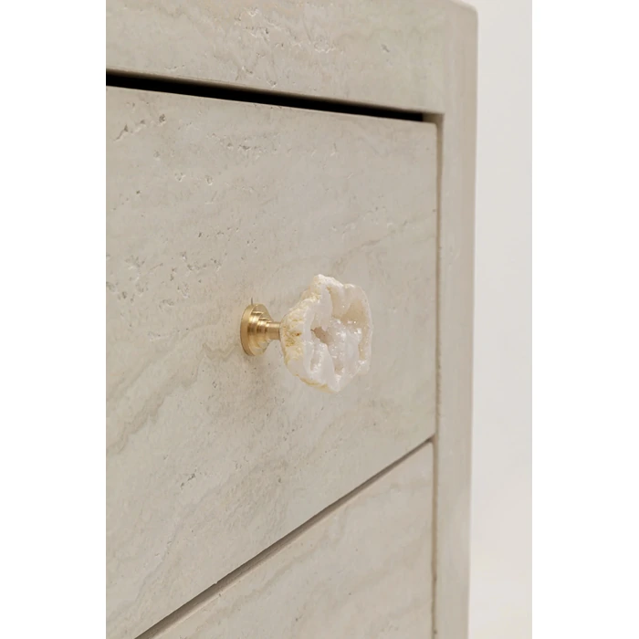 Den kompakta storleken gör byrån perfekt som nattduksbord, sidobord eller extra förvaring i hallen eller vardagsrummet. Två lådor med mjukstängande funktion erbjuder praktiskt utrymme för vardagsföremål, medan handtagen i kristalliknande geodsten tillför en lyxig och dekorativ detalj. Ett litet men uttrycksfullt designobjekt med tidlös karaktär.