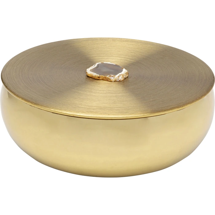 Dekor Burk Shine är ett gnistrande blickfång som kombinerar exklusiv design med praktisk funktion. Den runda burken är tillverkad i blankt guldfärgat stål och toppas av ett dekorativt lock med en naturlig agatsten som ger varje exemplar ett unikt uttryck.
