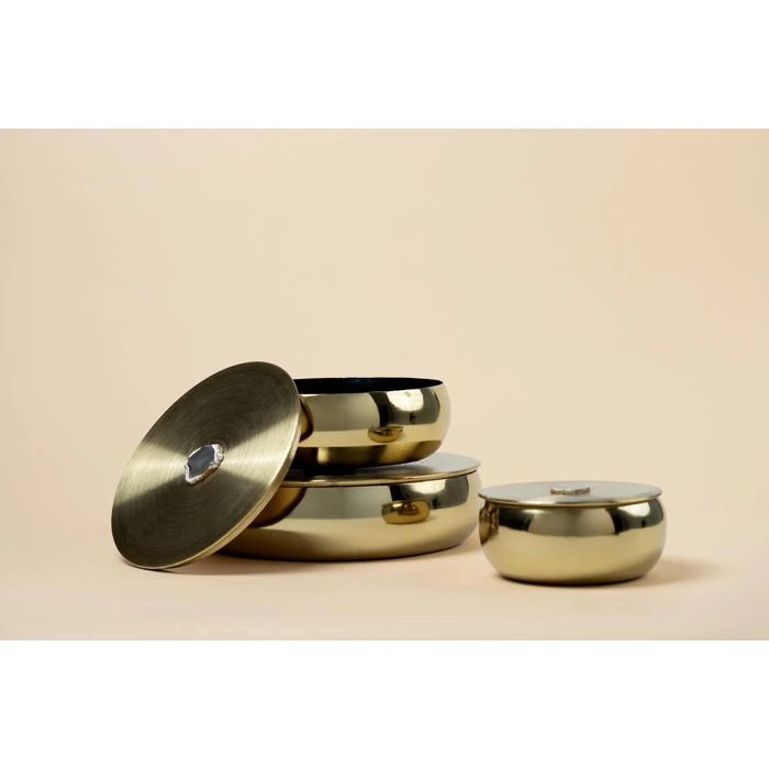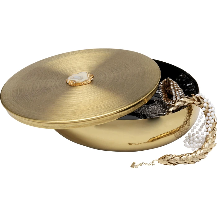 Dekorativ guldfärgad förvaringsburk i stål med exklusiv agatdetalj.