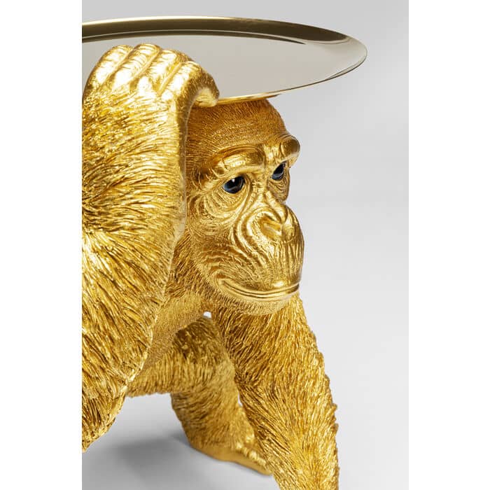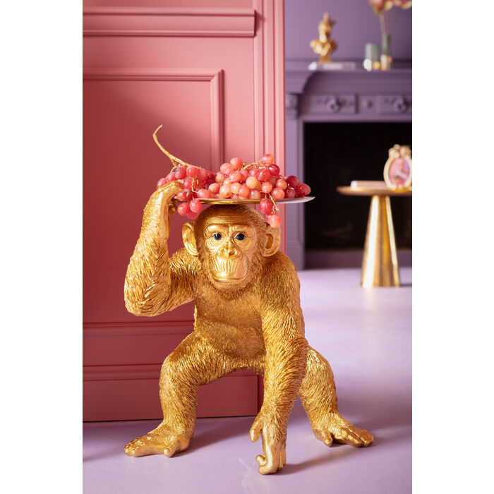 En härlig inredningsdetalj - både som dekor och serveringsfat. Denna charmiga apa håller i den löstagbara brickan där du kan servera små godsaker, drinken till gästerna eller använda den som bästa butler i hallen eller i ditt dressing room när du ska välja accessoarer, parfym m.m. Den här dekoren är helt enkelt en humörhöjare i varje rum.Skulpturen är mycket välgjord, här i guldfinish men finns även i naturtrogen stil. Se Dekor Chimp med bricka.