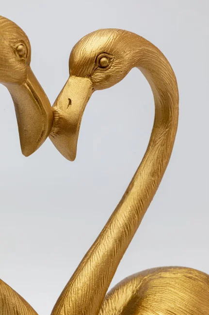 Två gyllene flamingos i guld bildar ett vackert hjärta med sin hals och näbb. Denna romantiska skulptur passar till sovrummet på nattduksbordet eller på skrivbordet i hemmakontoret eller på skänken i vardagsrummet. Med sin storlek på 39,3x29,5x8,2cm (H/B/D) passar dekorationen överallt och kommer att sätta ett leende på allas läppar. Prydnaden lägger till en särskilt vacker gyllene färghöjdpunkt till ditt hem. Denna hjärtvärmande inredningsdetalj är också perfekt present till din partner eller till ett brudpar.