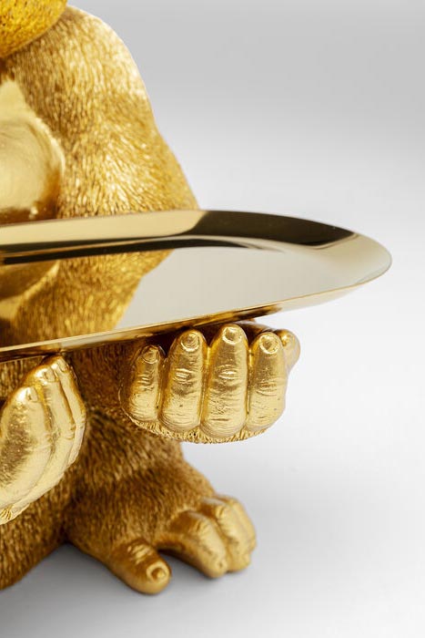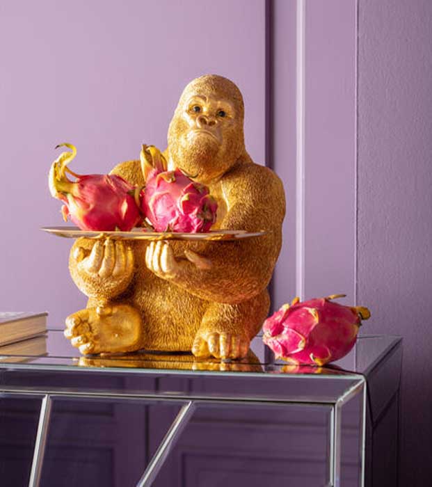 Vem vill inte bli serverad av en Golden Gorilla!? En humoristisk inredningsdetalj och annorlunda litet serveringsbord i form av en guldfärgad gorilla som håller i en bricka. Brickan är avtagbar så att du enkelt kan bjuda på godsaker till gästerna eller give-aways till kunderna. En eye-catcher i entrén, på bardisken och köks-ön eller din egen butler som håller koll på nycklarna, dina accessoarer, parfymflaskor och andra småsaker.