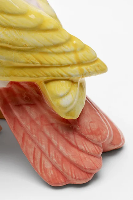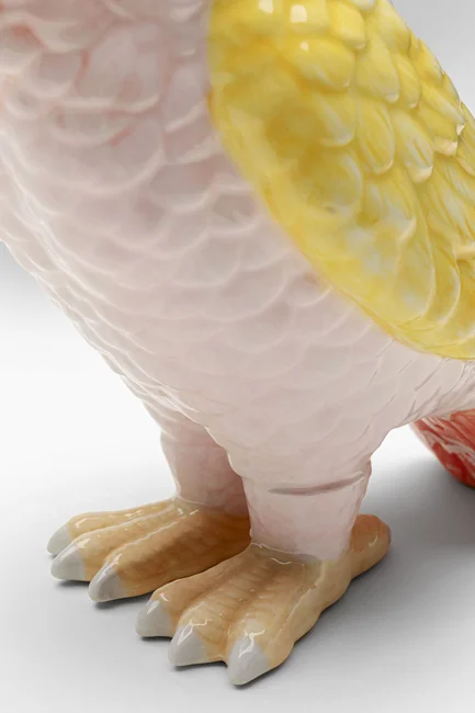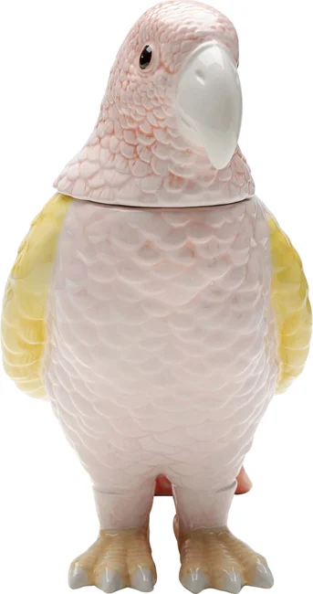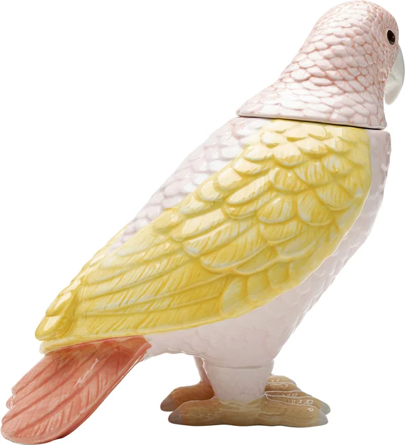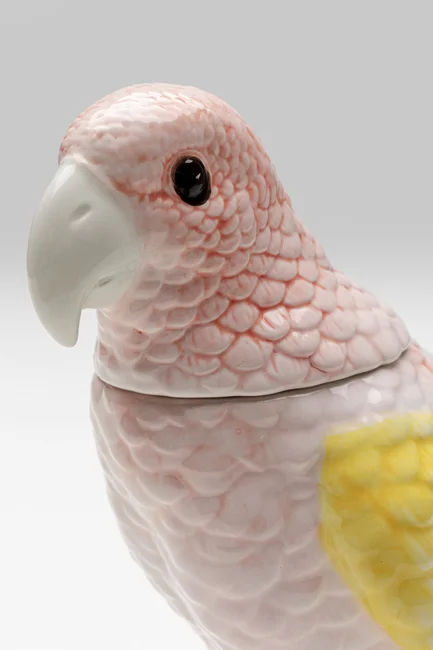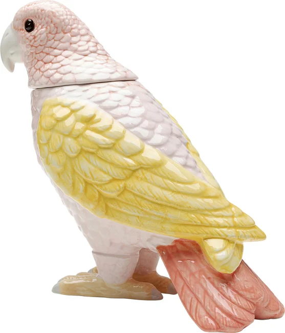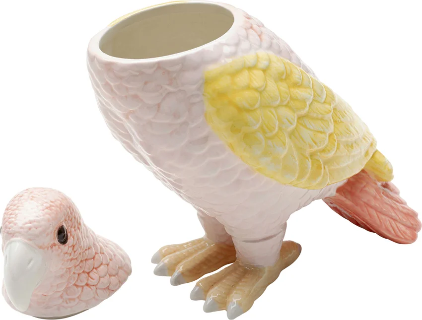 En söt fågel i läckra färger av rosa och gult. Praktisk liten fågelburk och skulptur i ett. Den söta pippin blir ett charmigt inslag i köket eller badrummet.