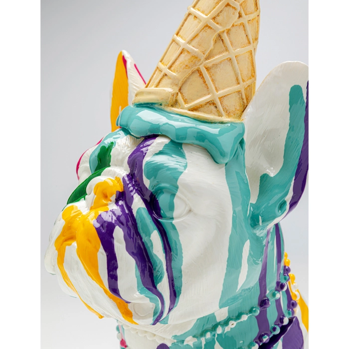 Unik, färggrann och lekfull skulptur av en fransk bulldog som tappat sin glass! Hundskulpturen har en vit grund och rinnande glass i färgerna rosa, turkos, grön, gul och lila som omsluter den. Hunddekoren är ett charmigt blickfång som kan ställas på konsolbordet i hallen, hyllan på kontoret, skänken i vardagsrummet och på köksön eller matbordet i köket.