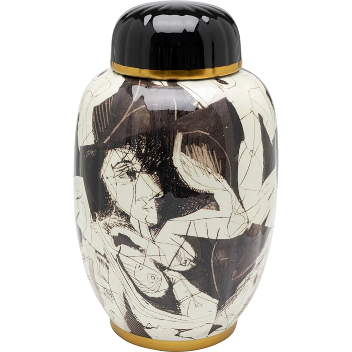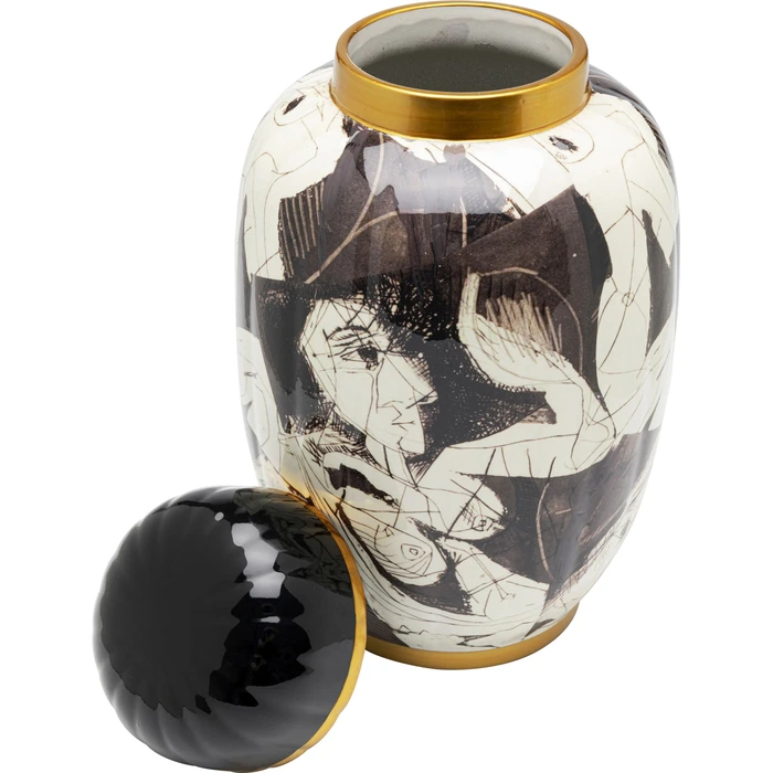 Dekorburk La Spezia är en elegant och funktionell inredningsdetalj tillverkad i fint lackerat porslin. Det konstnärliga mönstret i svart och vitt, i kombination med blanka gulddetaljer, ger burken ett exklusivt och sofistikerat uttryck som lyfter helhetskänslan i rummet.