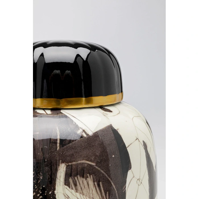 Dekorativ porslinsburk i svartvitt med gulddetaljer och lock.