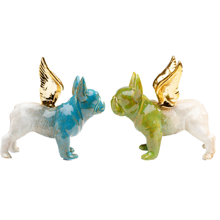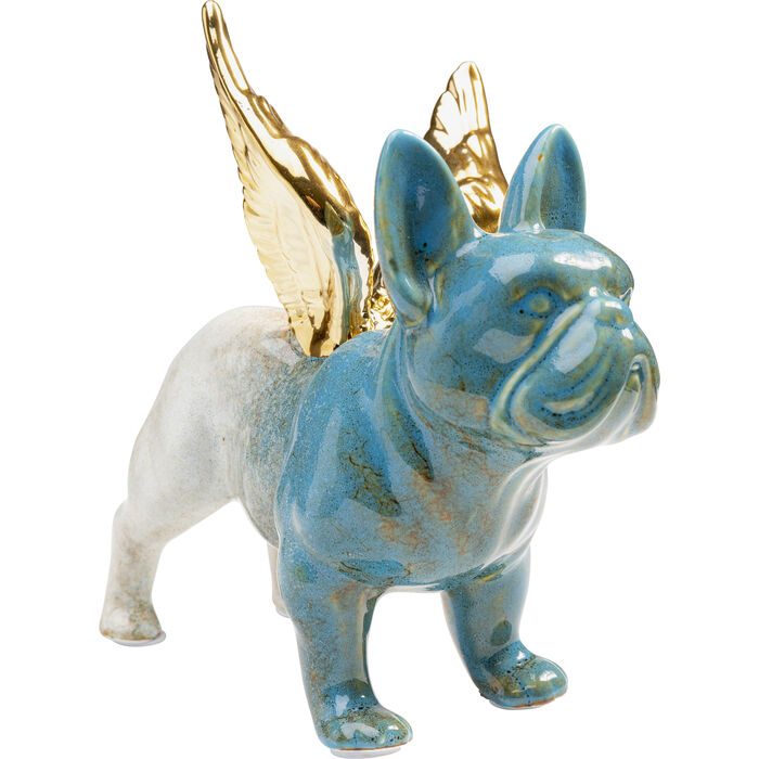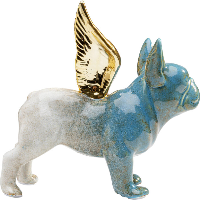 En snygg dekorfigur i vitt och blått föreställande en bulldog med vingar i guld.