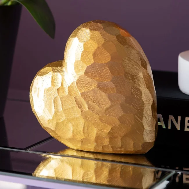 En stilren skulptur och dekorativ inredningsdetalj är detta vackra hjärta i guld som står stabilt på ena sidan. Vi gillar den lite kantiga "huggna" strukturen och den fina guldfinishen. Skulpturen är en omtänksam present till en kär vän, familjemedlem eller stora kärlek.