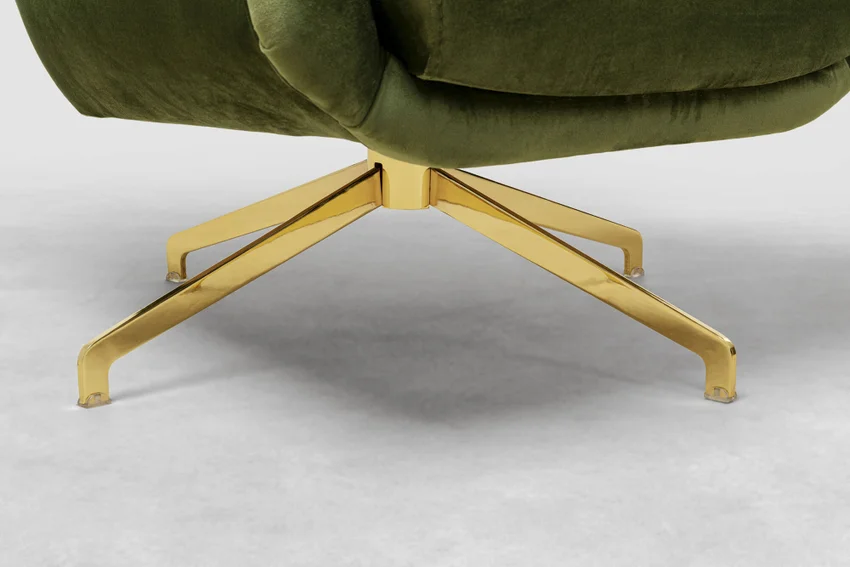 - En extravagant fåtölj med olivgrönt tyg och mässingpläterade metallben.