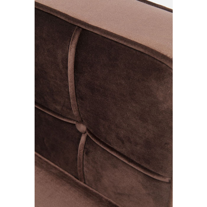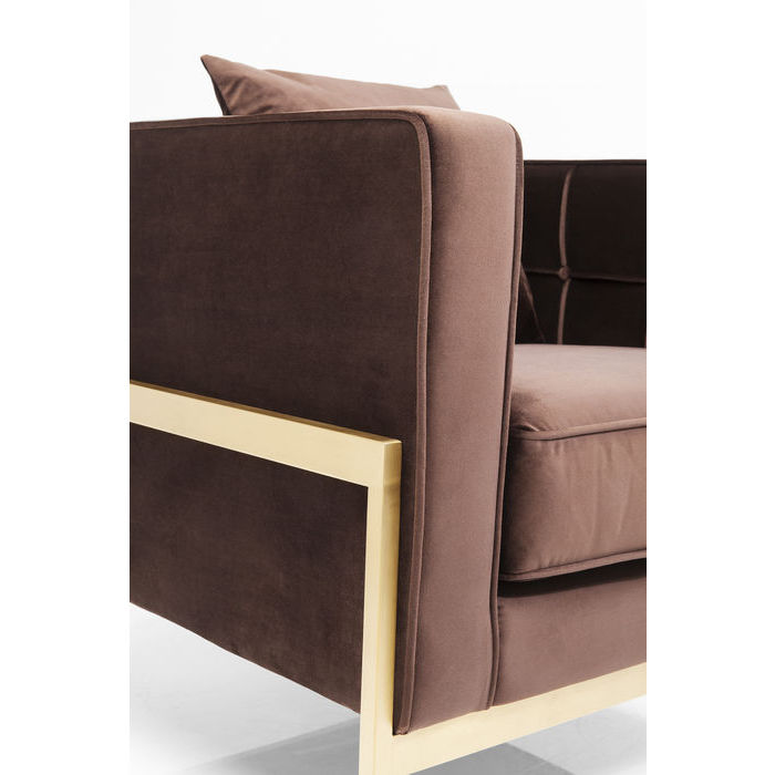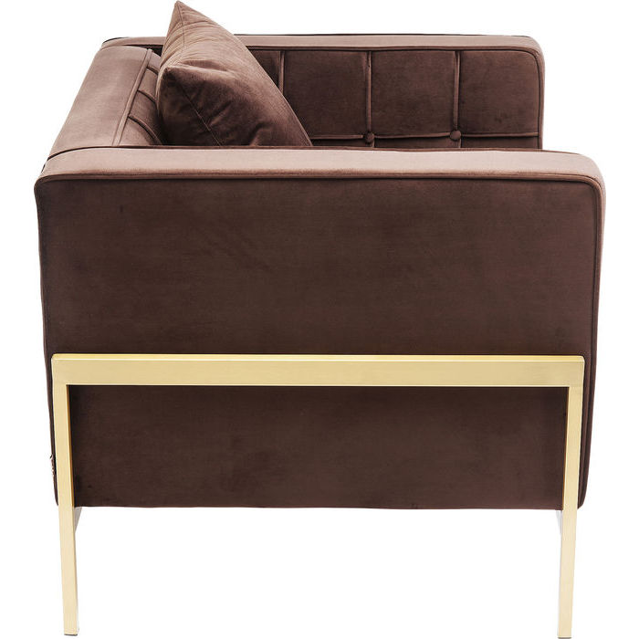En elegant fåtölj i mustig chokladbrun sammet med passpoal i rutmönster samt klädda knappar. Fåtöljen har ett stilrent underrede i mässing. Fåtöljen har en skön sittkomfort med lagom mjuk stoppning i sits samt skön ryggkudde. Fåtöljen finns även i andra färger och textilier.