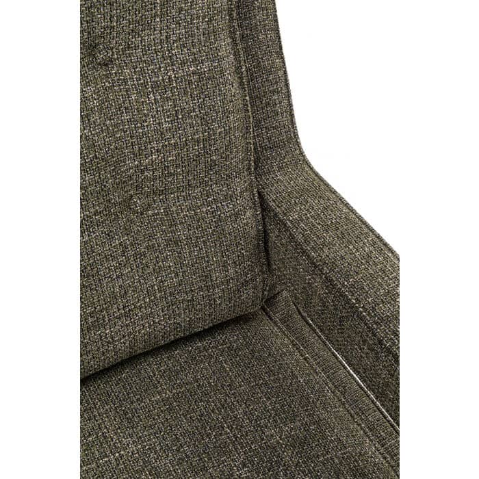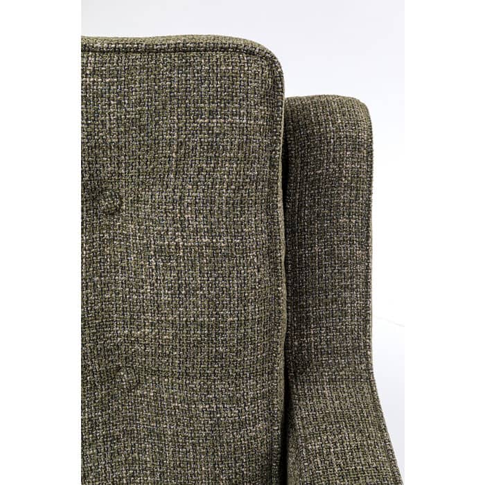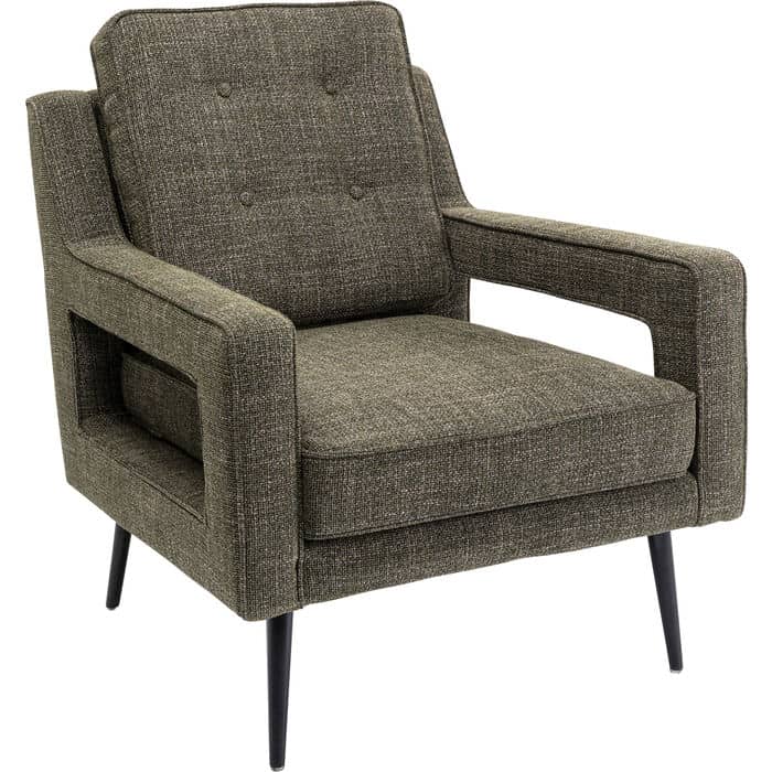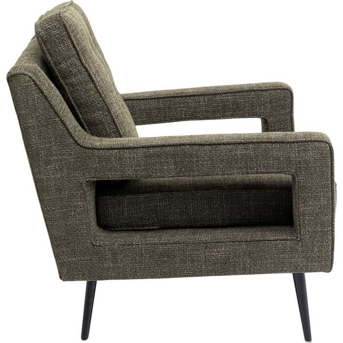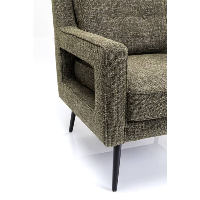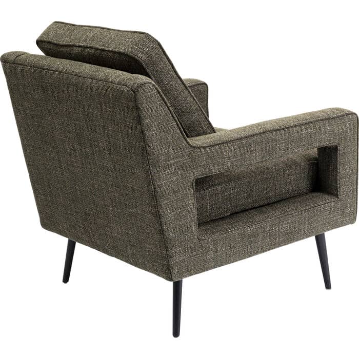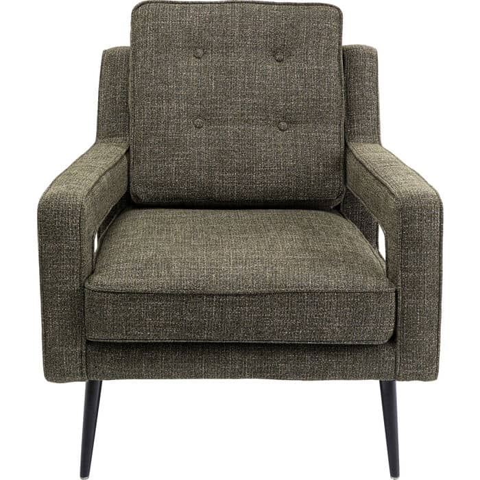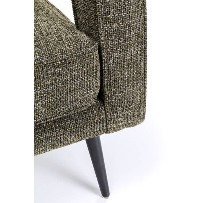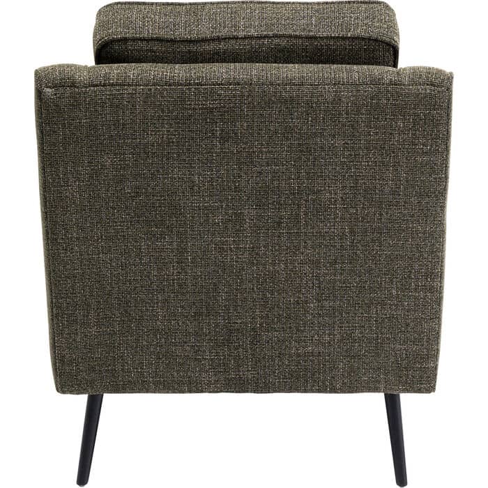 Det är definitivt en av våra favoriter! Fåtöljen har en spektakulär retro design, klädd i snygg olivgrön vävstruktur och med en maximal sittkomfort. Denna fåtölj inbjuder till skönaste avkoppling och du kommer inte att vilja gå upp igen, så bekvämt är den. Nätta, stabila ben i svart pulverlackat stål.