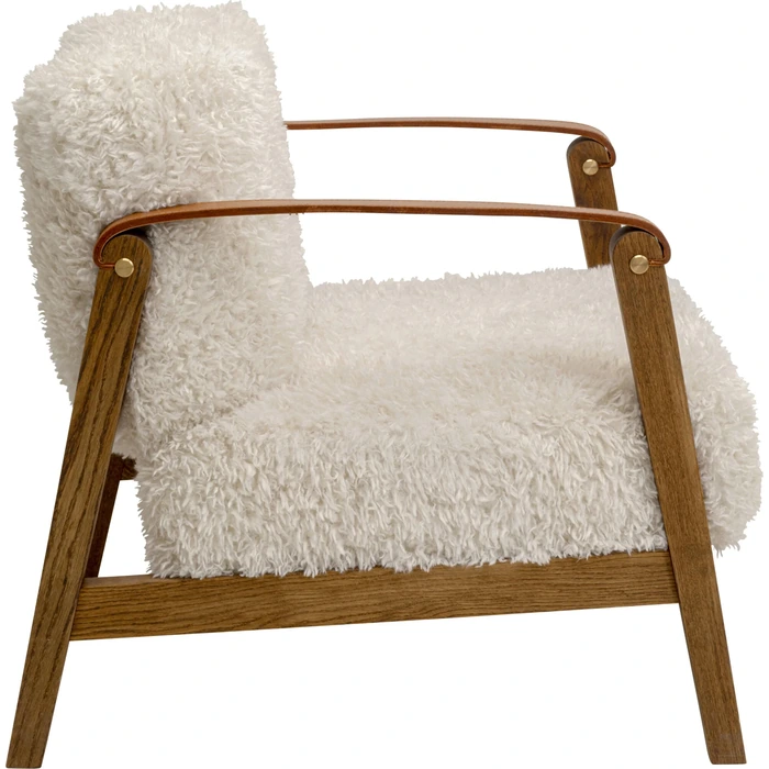 Exklusiv relaxfåtölj i creme med trä och läderdetaljer.