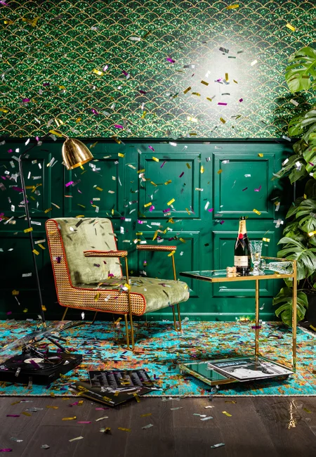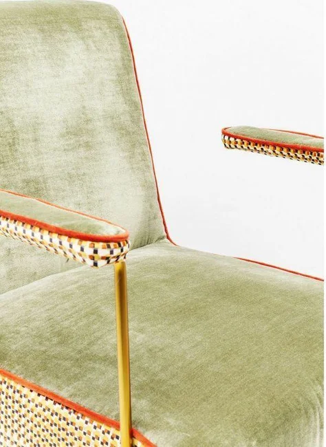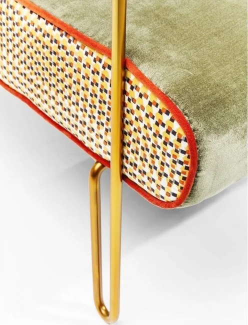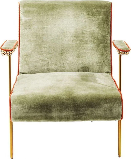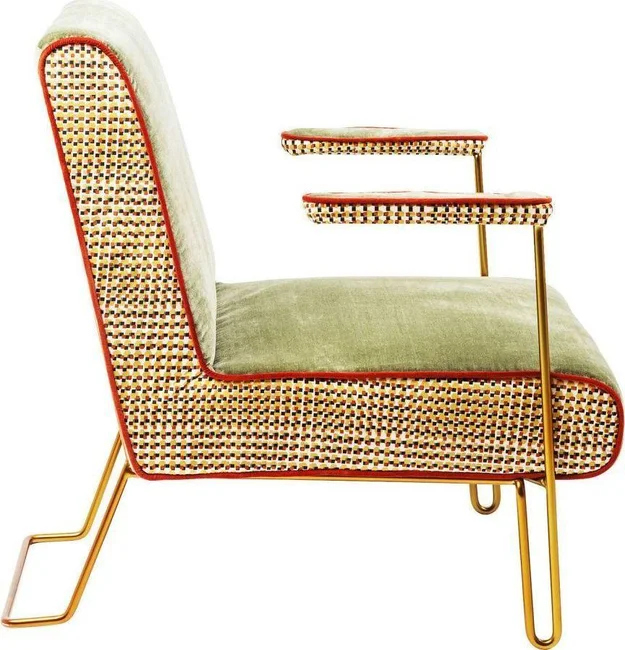 Denna eleganta fåtölj är en perfekt blandning av modern komfort och tidlös retrodesign. Med inspiration från 60-talets ikoniska stil erbjuder stolen en härlig, ljusgrön konstsammet som skapar en inbjudande och lyxig känsla. De tunna, gyllene benen och armstöden i matchande design ger fåtöljen ett luftigt och sofistikerat utseende, medan de färgstarka detaljerna i rött och flätade mönster på sidorna tillför en lekfull touch. Denna fåtölj är idealisk för dig som vill ge ditt vardagsrum en stilfull och personlig prägel med en nostalgisk twist.
