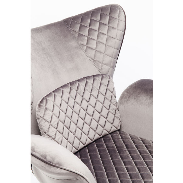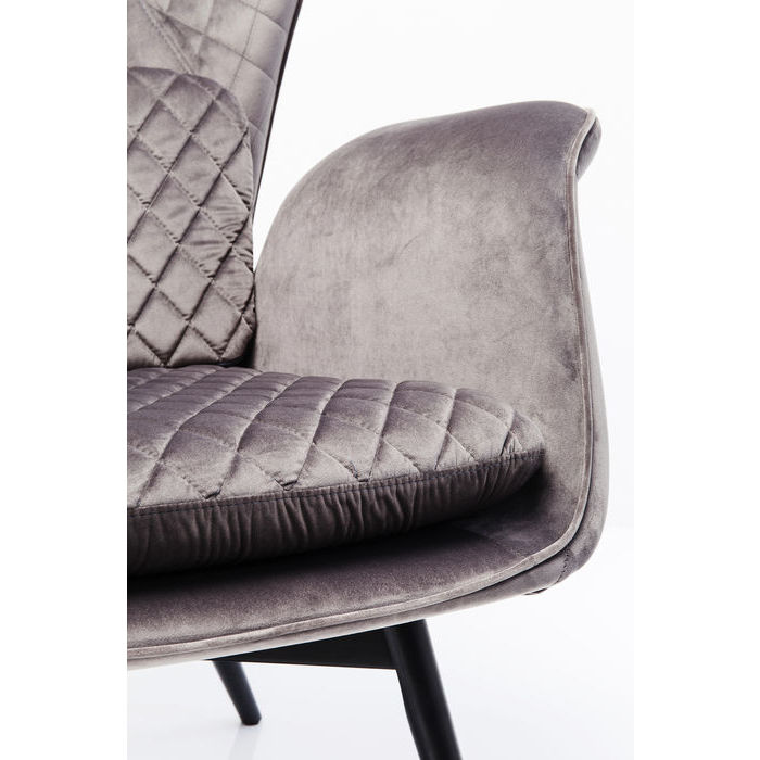 Vackra fåtölj Tudor finns nu även i denna silvergrå sammet med distinkt design, välklädd med dekorativa detaljer i sömmar. Fåtöljen är mycket bekväm med hög rygg och rejäla armstöd samt skön mjuk stoppning som också ger stabilt stöd. Fåtöljen har en smäcker form med tydlig 50-tals inspirerad form.