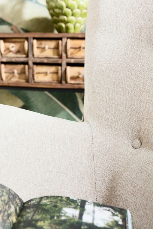 Fåtölj med tyg i ljus linnestruktur av hög kvalitet