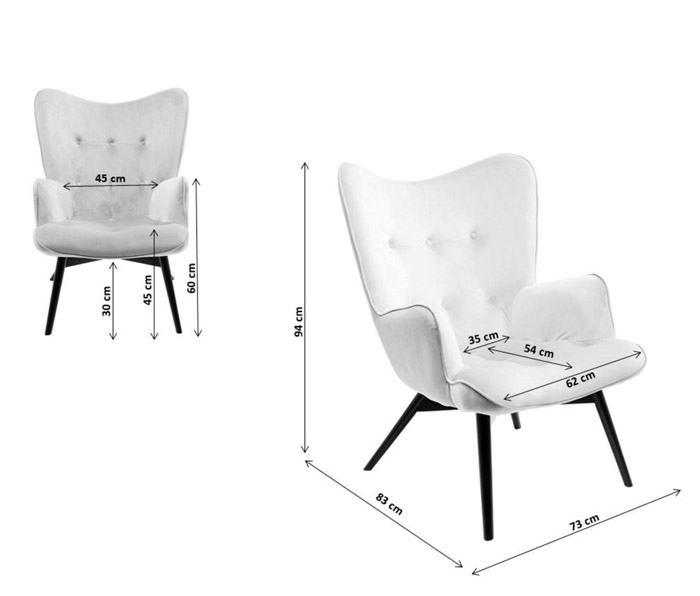 Mått: Höjd 94 x bredd 73 x djup 83 cm / Sitthöjd: 43cm / Höjd på armstöd (från golv) 60 cm.