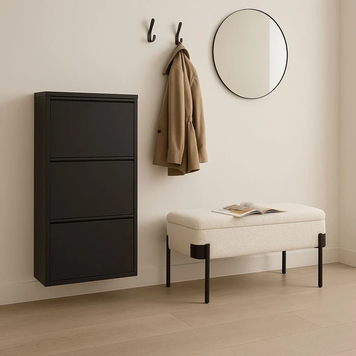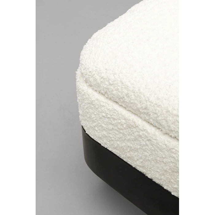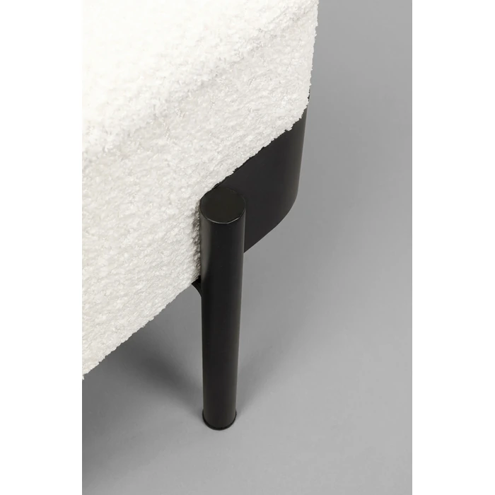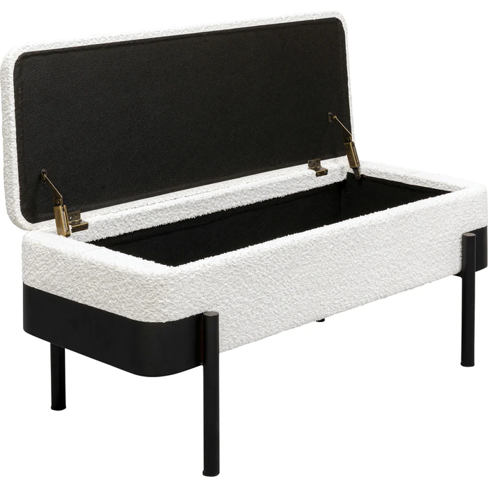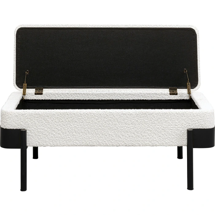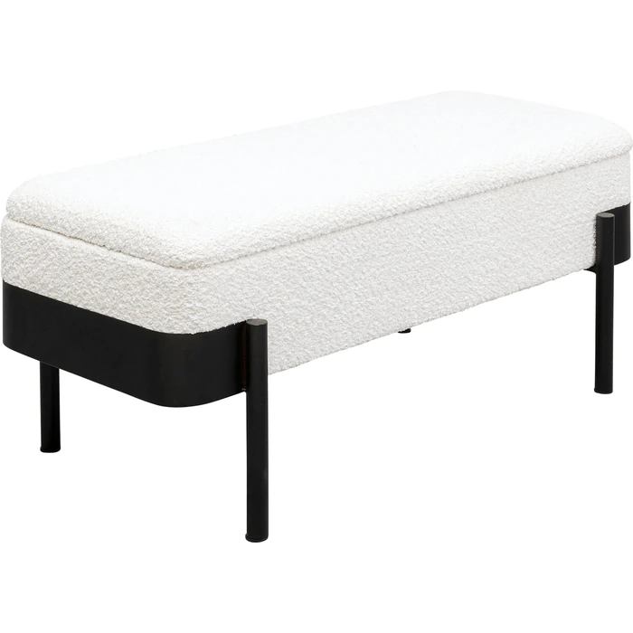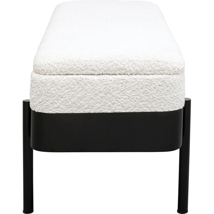 Smal förvaringsbänk i vit bouclé med svart metallstomme – mjuk sittplats och praktiskt dolt utrymme.