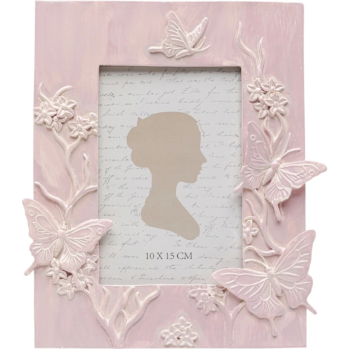 En dekorativ fotoram i rosa med fina fjärilsdetaljer som sätter en poetisk prägel på hylla eller sidobord. Passar perfekt för dina favoritminnen och ger interiören en mjuk, romantisk ton.