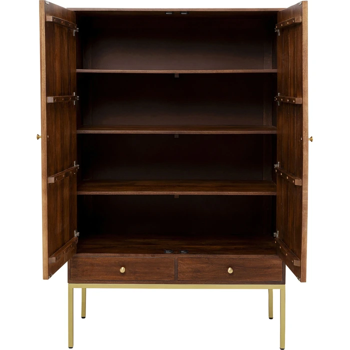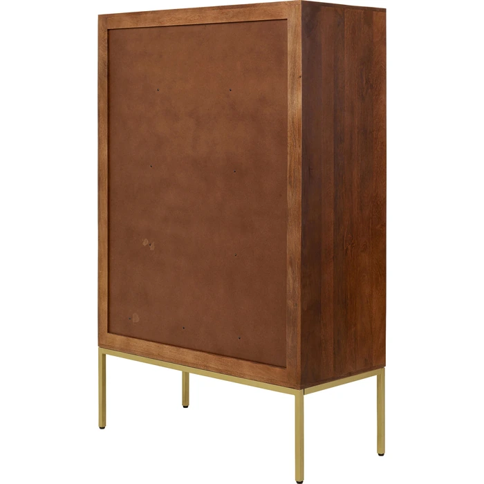 Skåpet är utrustat med fyra praktiska hyllplan som lämpar sig för kläder, böcker, porslin eller organisering av vardagsföremål. De slanka mässingsfärgade stålbenen ger en elegant kontrast till träets naturliga struktur och förstärker möbelns exklusiva uttryck.