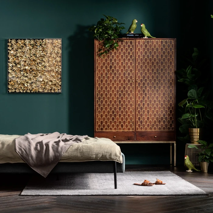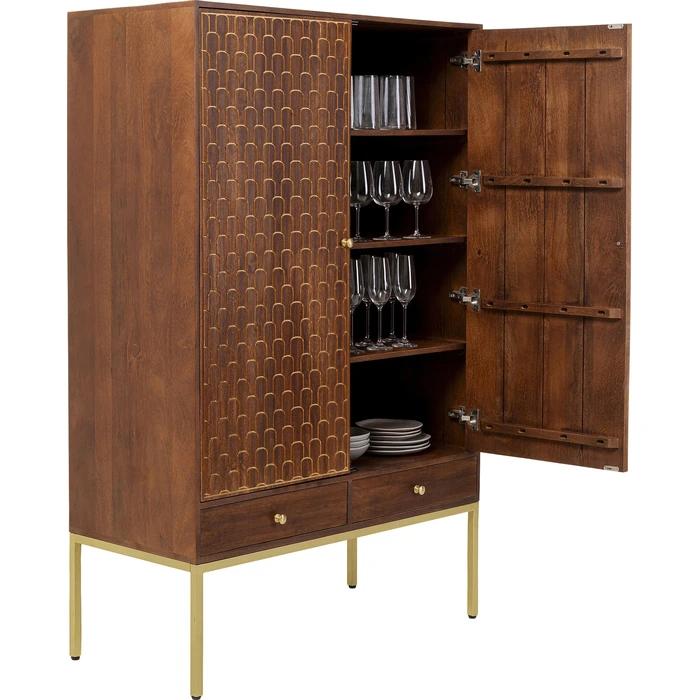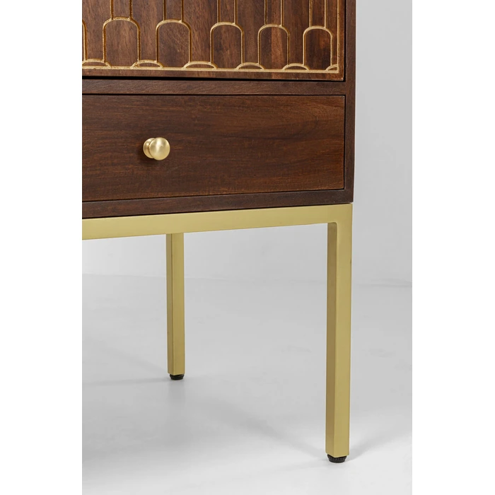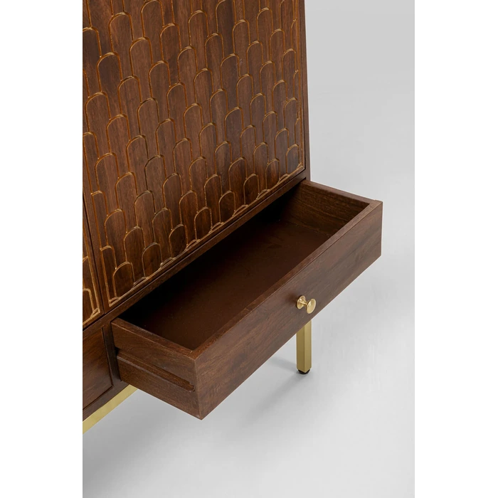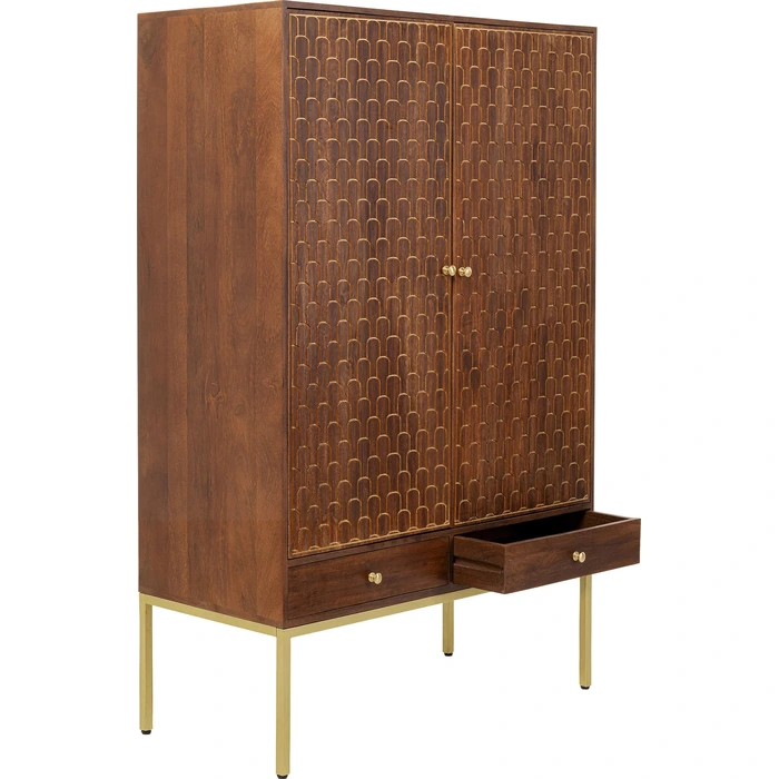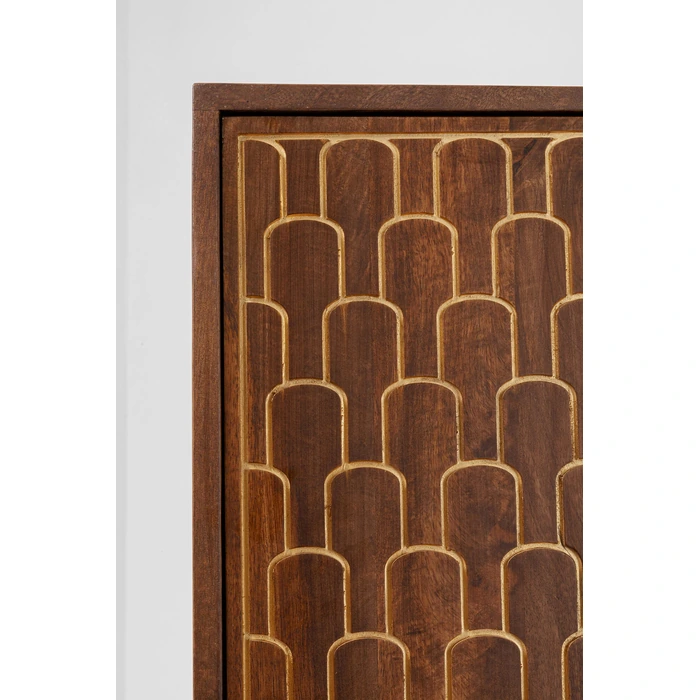 Garderob Muskat är ett praktfullt högskåp i massivt trä med handgraverade, gyllene orientaliska mönster som gör varje exemplar unikt. De dekorativa dörrarna skapar ett uttrycksfullt blickfång med tydlig mid-century-karaktär, samtidigt som möbeln erbjuder generöst med förvaring.