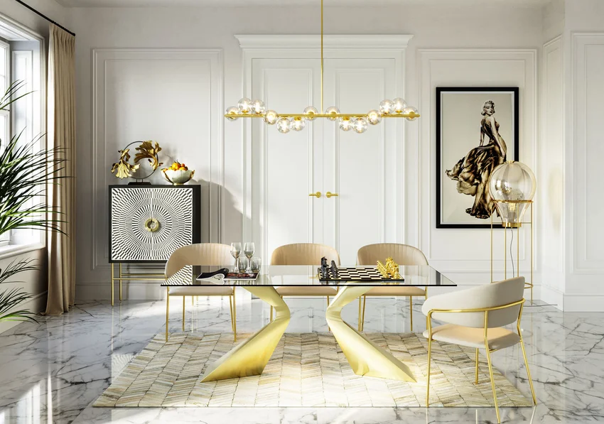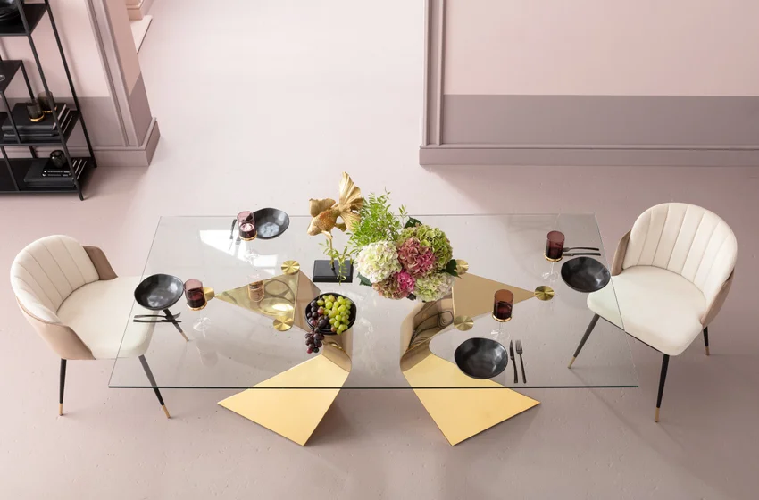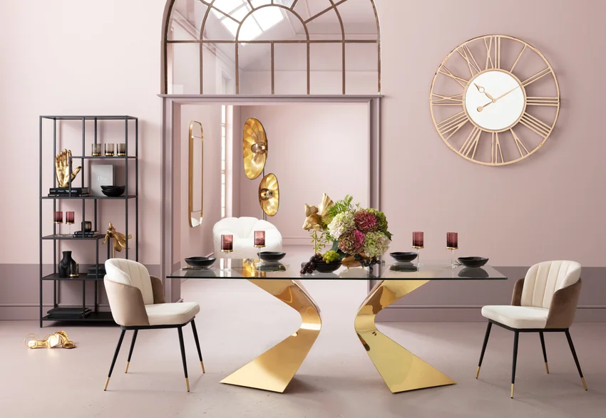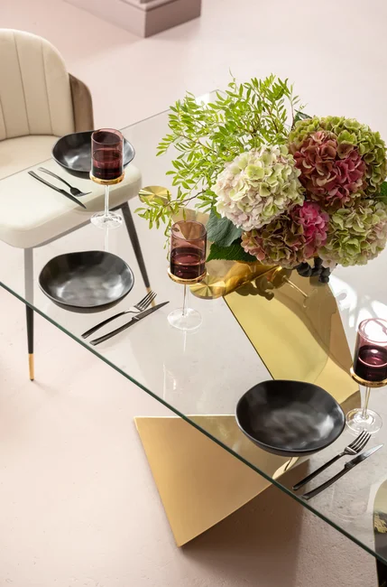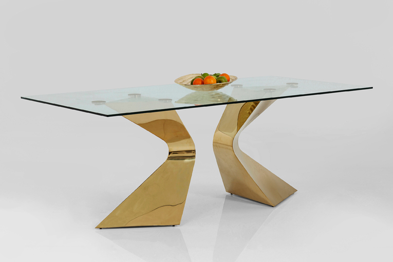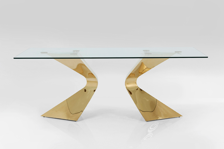 Detta lyxiga matbord slår igenom med sin kreativa form och eleganta, något excentriska känsla. Den 13 mm tjocka bordsskivan i säkerhetsglas stöds av två konstnärligt formade, guldfärgade ben. Bordet är perfekt lämpat för en glamorös, lyxig och eklektisk interiör. Detta förbättrar stjärnkvaliteten på din inredning.