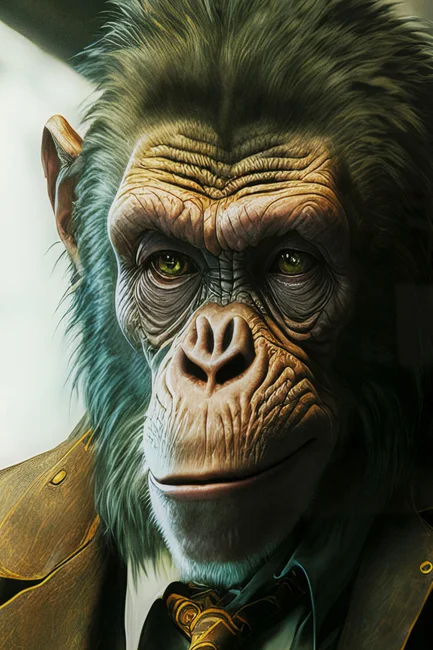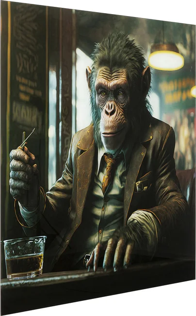 Denna fantastiska tavla är ett unikt konstverk som kommer att sätta prägel på din inredning – en glastavla som fångar essensen av stil och humor. Föreställningen av en schimpans klädd i en elegant kostym, avslappnat sittandes i en bar med ett glas whiskey i handen, är både charmig och fascinerande. Denna tavla är perfekt för dig som vill tillföra en lekfull men ändå sofistikerad touch till din hemma-bar, man cave eller ditt vardagsrum. Det dämpade, varma ljuset i baren skapar en atmosfär som är både inbjudande och mystisk.
