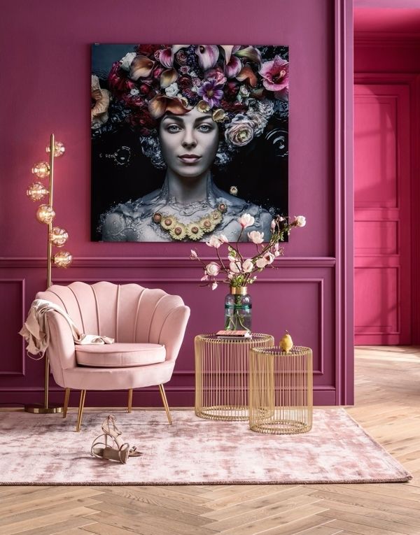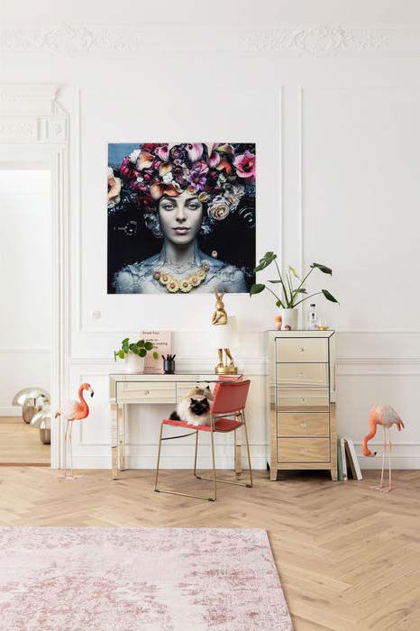En magnifik skönhet är denna blomstergudinna som fotokonst med print direkt på glas. Om färgskalan i inredningen går i neutrala grå, vita och beiga toner så blir detta en färgklick. Alla våra glastavlor har distanser i bakstycket vilket gör att den kommer ut ca 4 cm från väggen för ett modernt, sobert intryck.