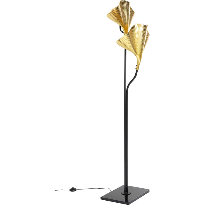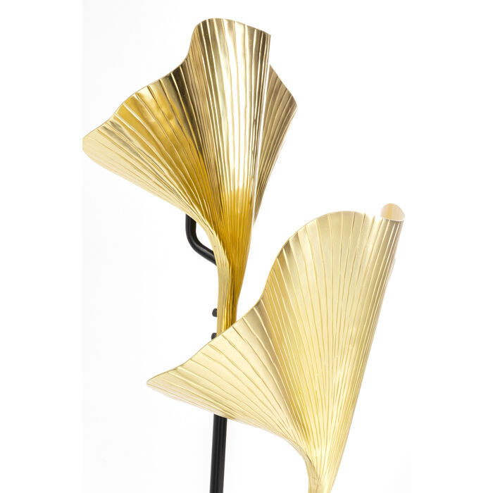En glamorös golvlampa med två stycken guldfärgade ginkgo-blad tillverkade av aluminium.