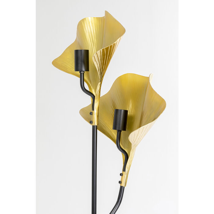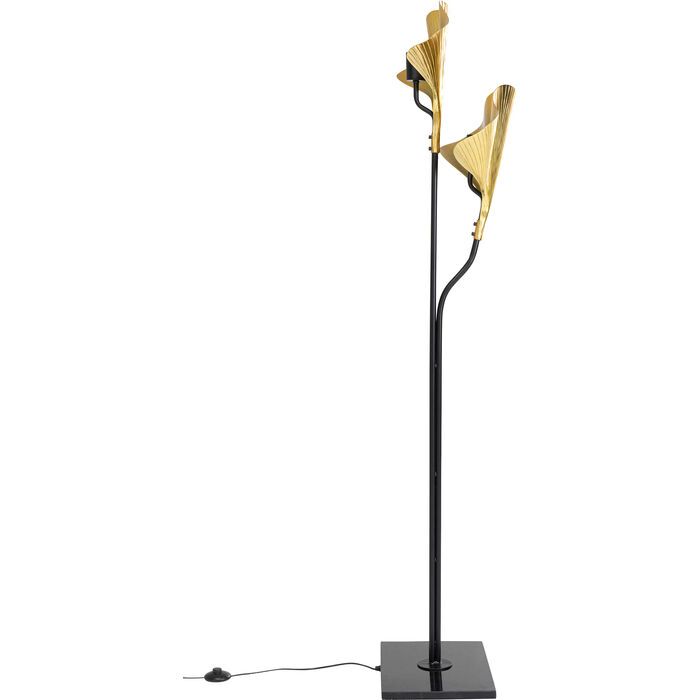 En glamorös golvlampa med två stycken guldfärgade ginkgo-blad tillverkade av aluminium och en svartlackerad stomme av stål fäst i en rejäl lampfot av marmor.